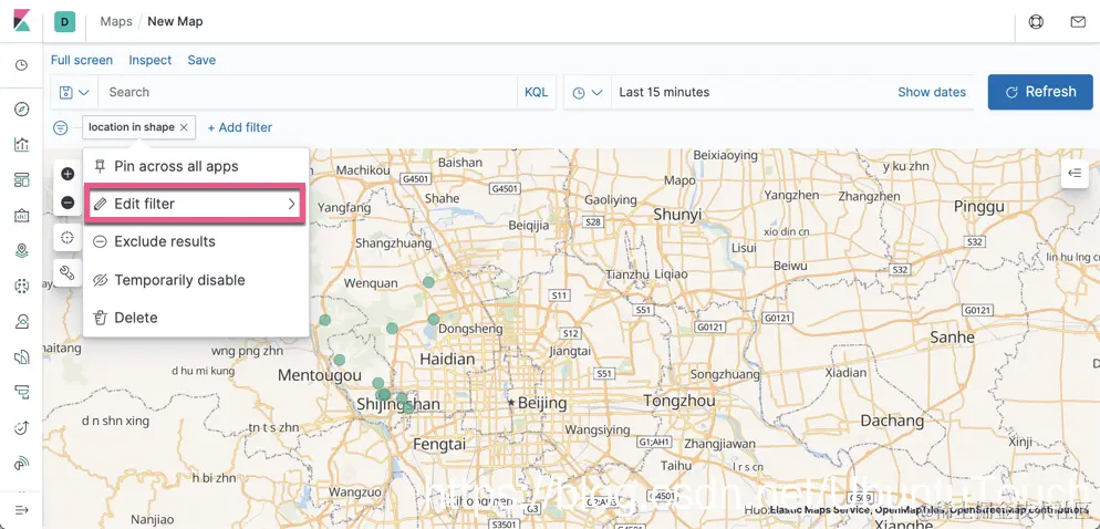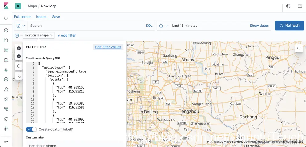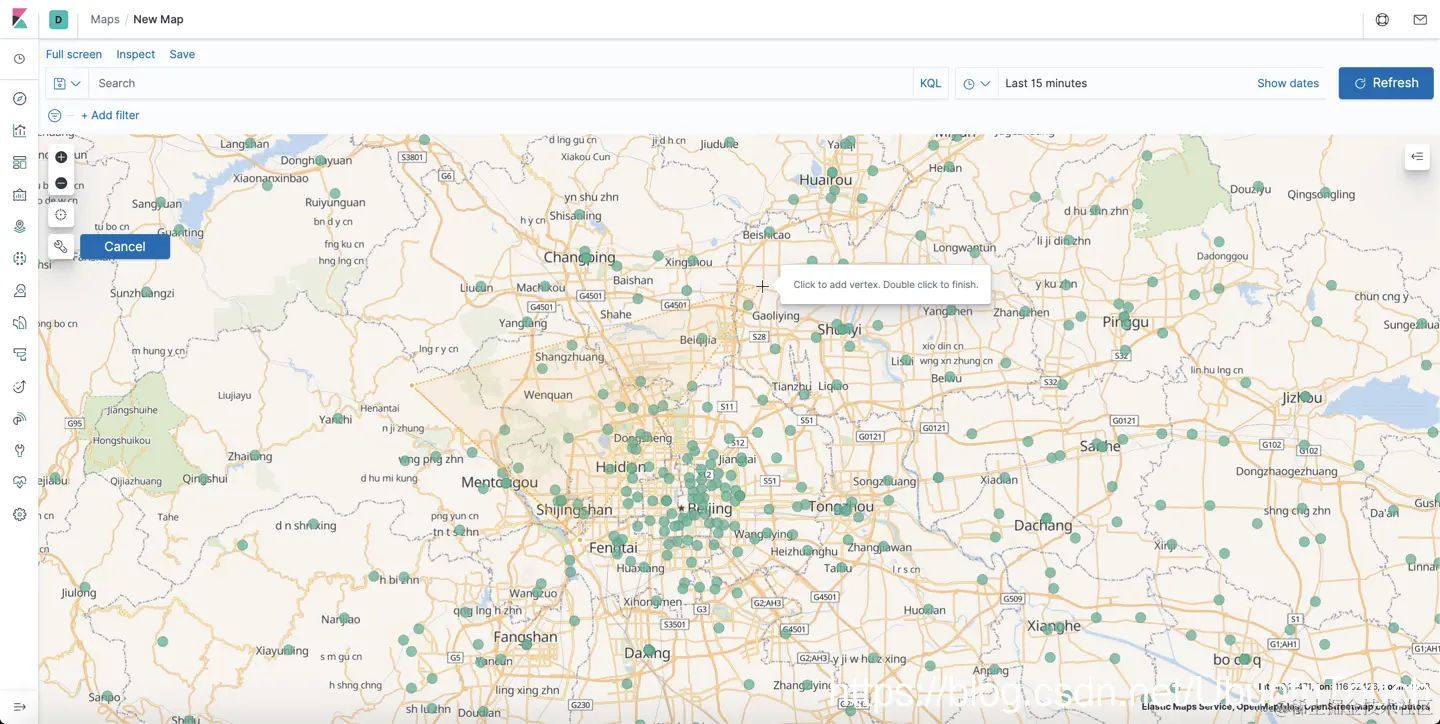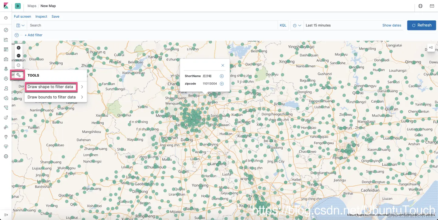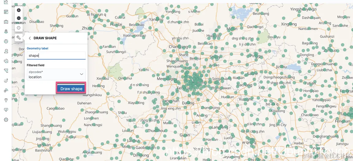 我们可以在我们喜欢的区域用鼠标来标出我们想搜索的区域,最终我们形成一个 filter,从而只显示出该区域里的文档: