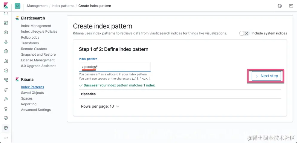 在上面我们可以很方便地搜索我们的数据。我们同时也可以使用Kibana提供的强大的图像化工具来展示我们所有的文档。为此,我们首先来创建一个叫做 zipcodes 的 index pattern: