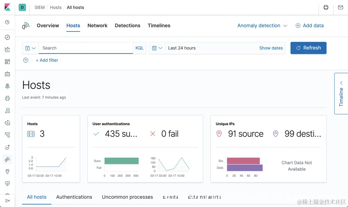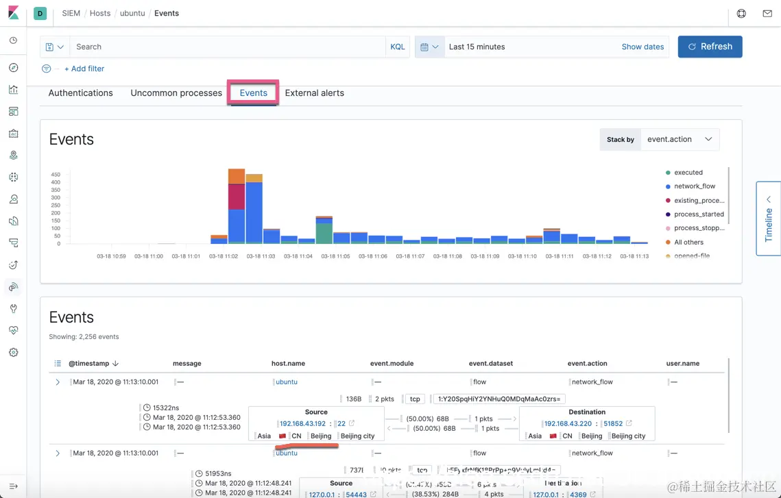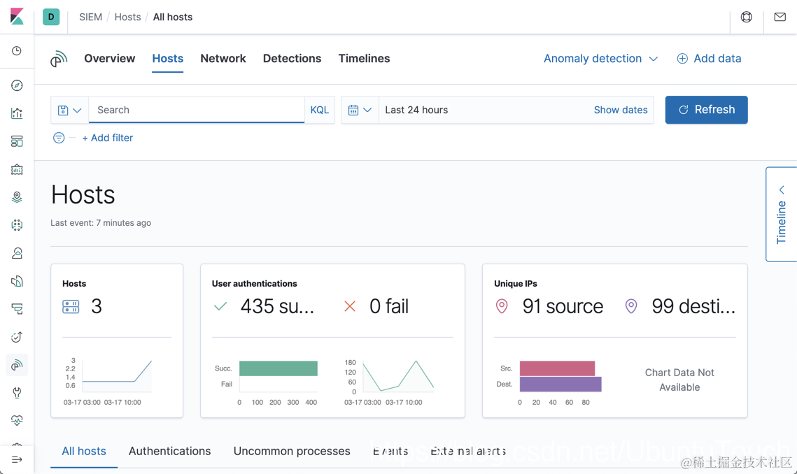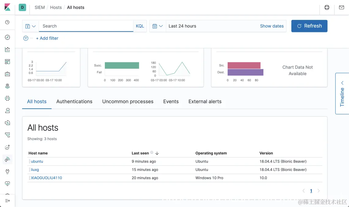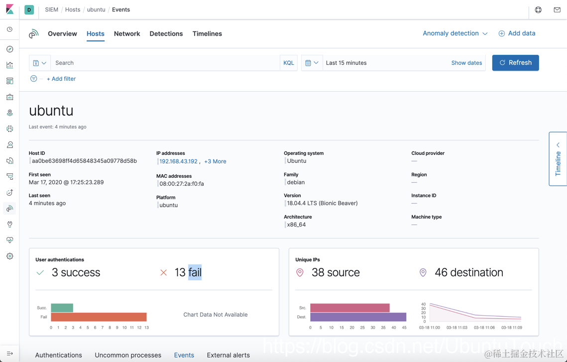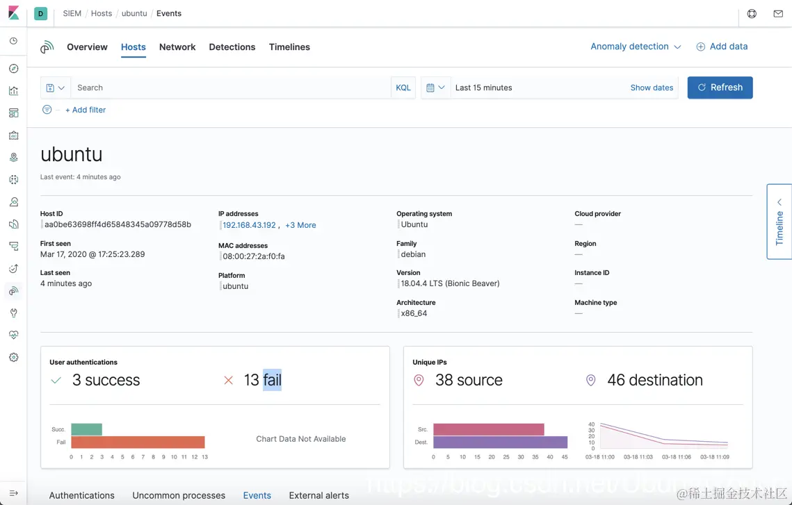 在上面,我们可以看到关于这个 ubuntu host 的统计情况。我们可以从下面的 Authentications, Uncommon processes, Events 及 External alerts 来进行搜索: