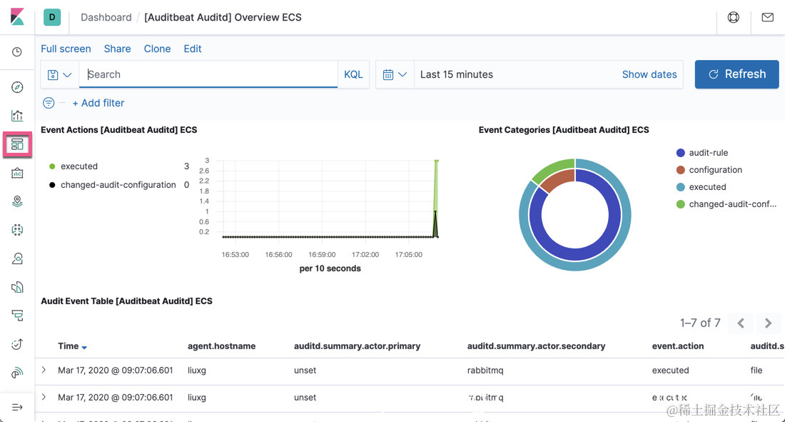 等我们的auditbeat已经被成功运行起来后,我们可以在Kibana的Dashboard中看到如下的画面: