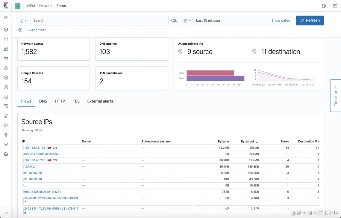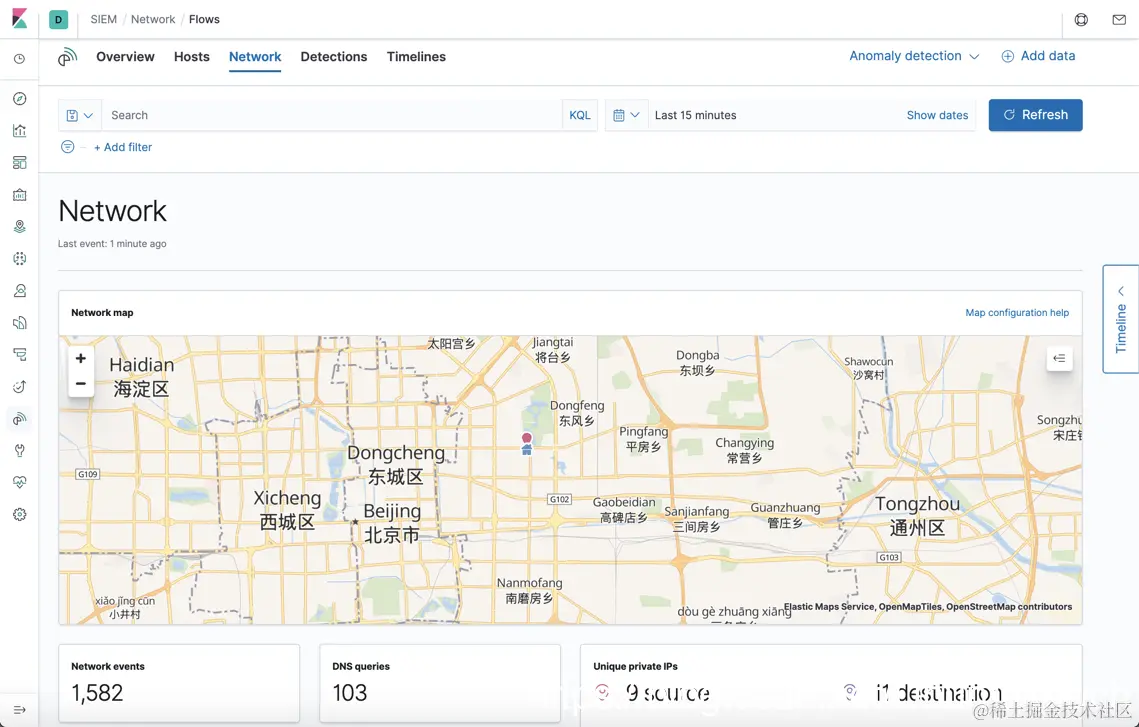 由于我们添加了 Packetbeat 和 Auditbeat,我们可以得到 Network 的情况: