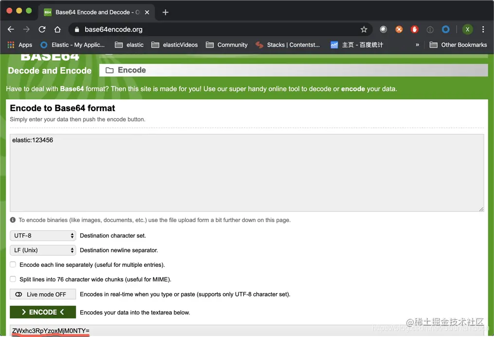 我们在网上找一个计算 base64 的在线工具 Base64 Encode and Decode - Online。假设我们的用户名是 elastic,而我们的密码是123456。
