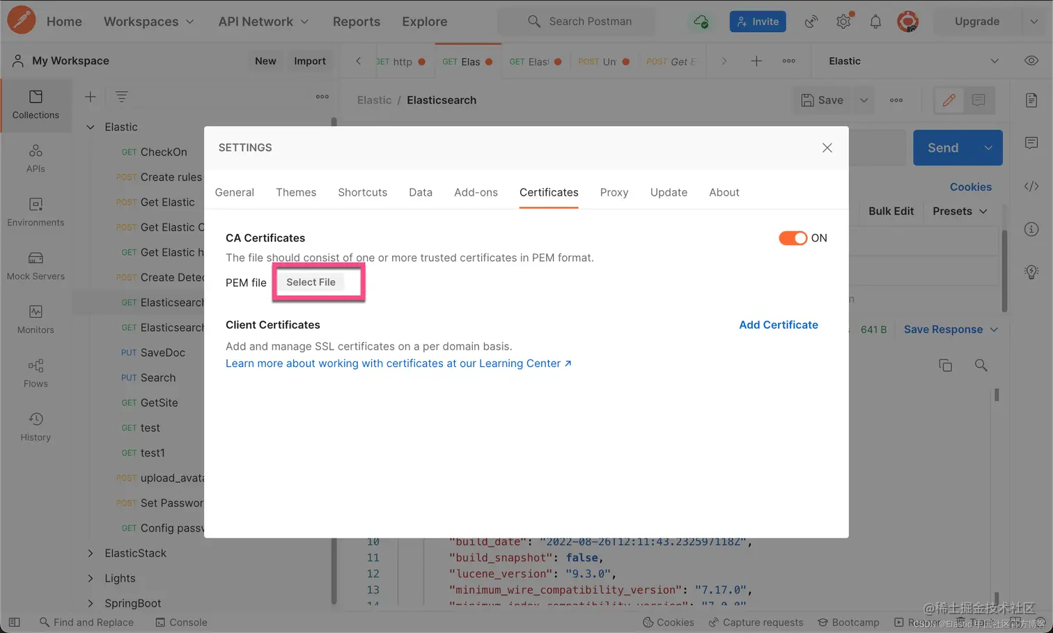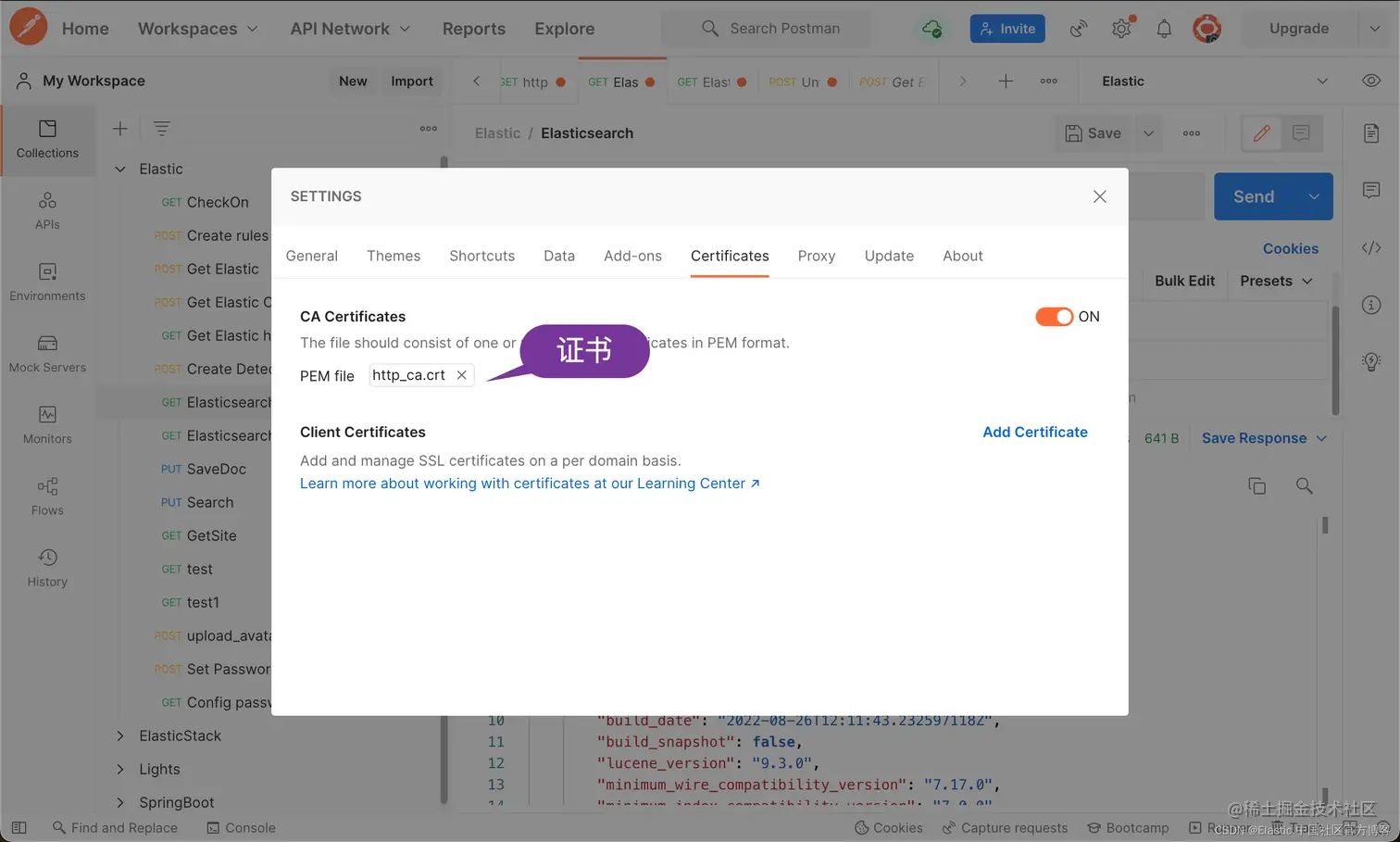 在最新的 Elastic Stack 8.x 的部署中,带有 SSL 访问的集群是默认的配置。针对客户端的访问,我们必须使用 HTTPS 的连接,那么我们该如何通过 Postman 来进行访问呢?如果你对 Elastic Stack 8.x 的安装还不是很熟的话,请参考文章 “如何在 Linux,MacOS 及 Windows 上进行安装 Elasticsearch”。特别需要指出的是,你需要阅读 “Elastic Stack 8.x 安装” 这个章节。关于如何安装 Elasticsearch 8.x,这里就不再累述了。