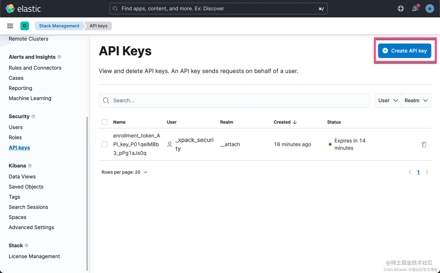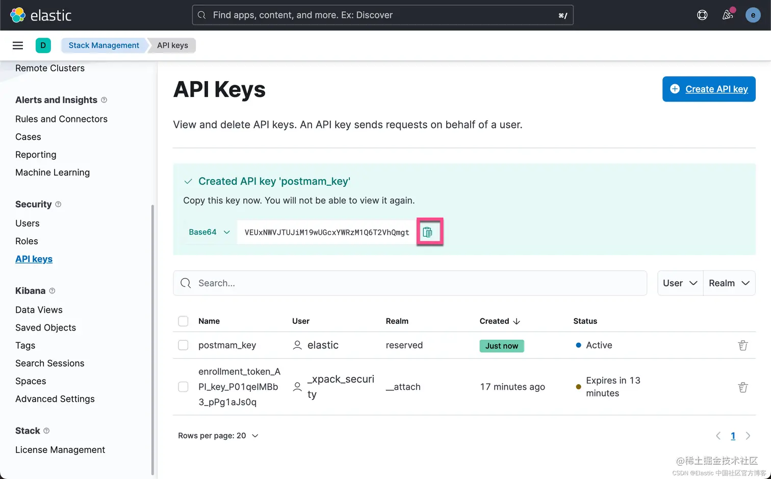 在很多的时候,我们觉得使用用户名及密码发送请求并不安全。我们可以通过 API token 的方式来进行连接。我们首先使用自己的账号登录 Kibana,并申请 API token: