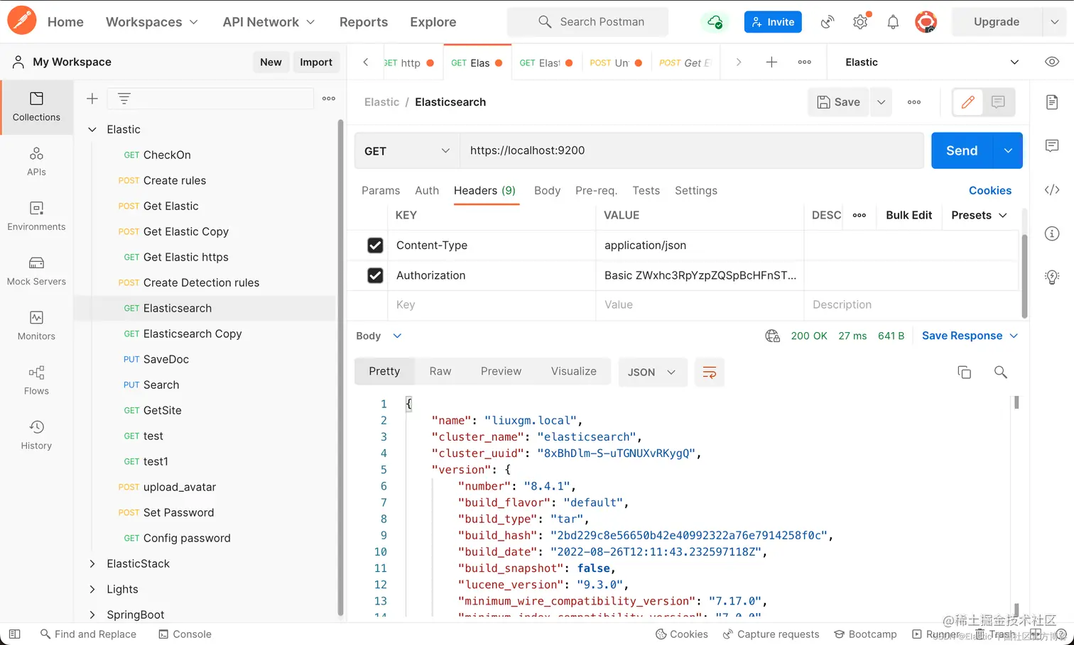 对于很多的开发者来说,他们很习惯用 Postman 来测试 REST 接口。在我之前的文章 “如何在 Linux,MacOS 及 Windows 上进行安装 Elasticsearch” 中,我也展示了如何使用 Postman 来访问我们的 Elasticsearch。对于 Postman 访问 Elasticsearch 来说,非常地直接。但是在那里有一种情况,我没有展示,那就是:当一个集群启动安全过后,我们该如何使用用户名及密码来访问我们的 Elasticsearch 集群呢?
