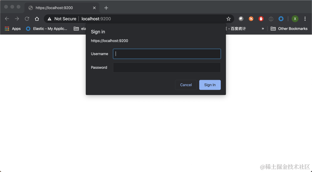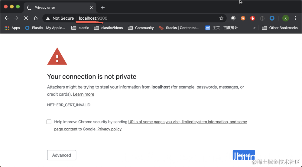 这样我们的 Elasticsearch 已经成功地运行于 https 模式。我们在 chrome 中打入地址 https://localhost:9200,我们可以看到: