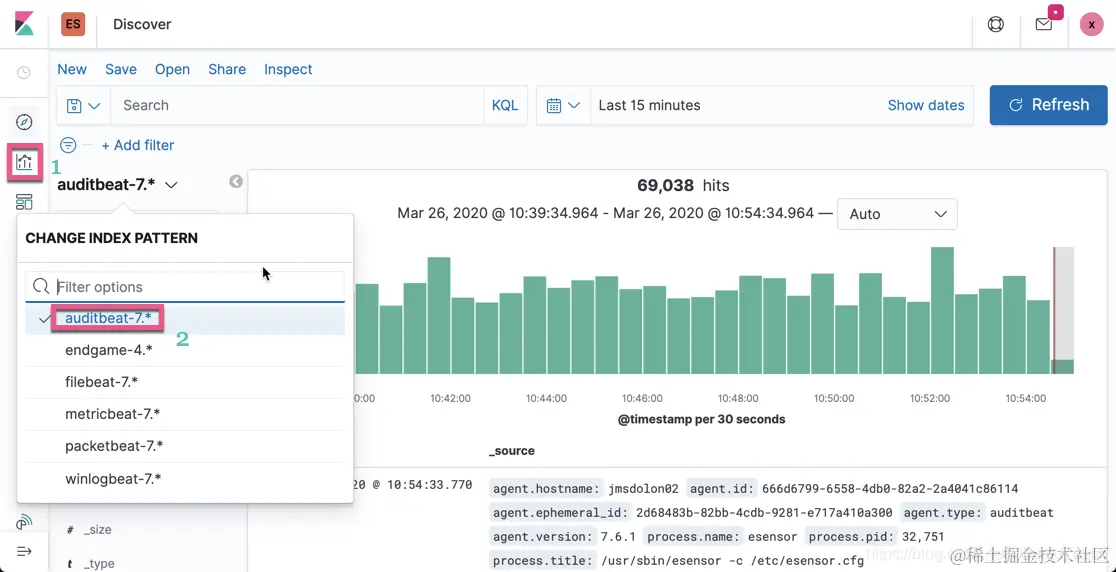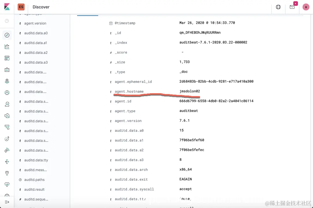 在上面我们可以选择我们喜欢的 Index pattern,来对数据进行搜索。在上面我们选择 anditbeat-7.*,在显示的右下方,我们可以看到每一个文档或事件。我们可以展开这个事件看到更为详细的事件信息:
