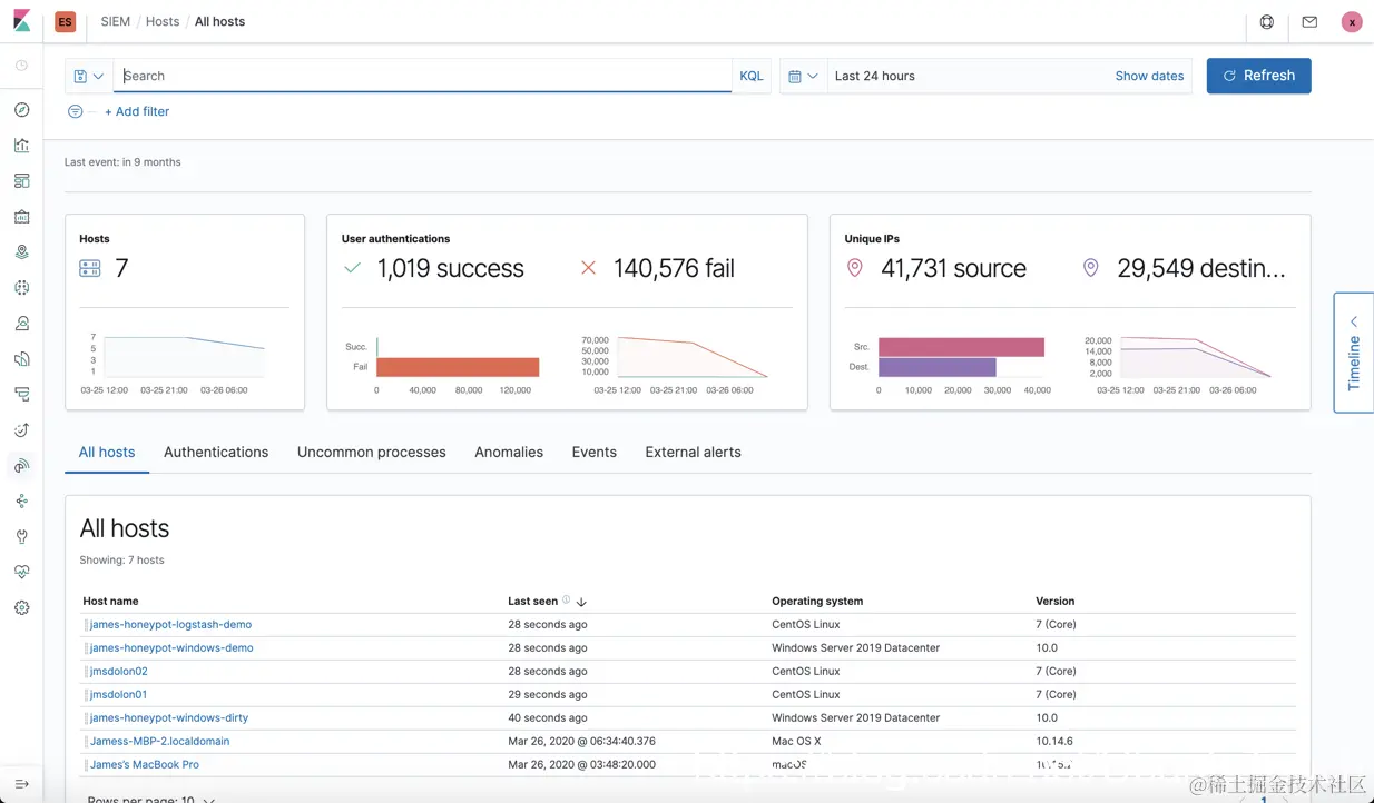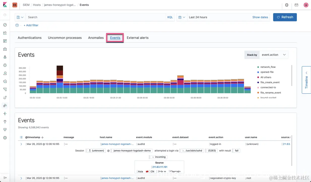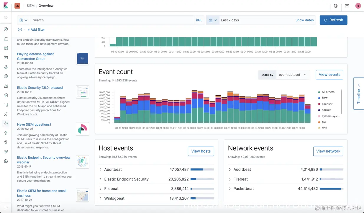 如上图所示,我们可以看见我们关心的两类 Events:Host events 及 Network events。如我们之前的练习一样,它们的数据来源来自于 Auditbeat,Filebeat, Winlogbeat, Packetbeat 及 Elastic Endpoint Security。针对 Elastic Endpoint Security 目前我们还没有涉及。在将来的文章中,我们将分别介绍。