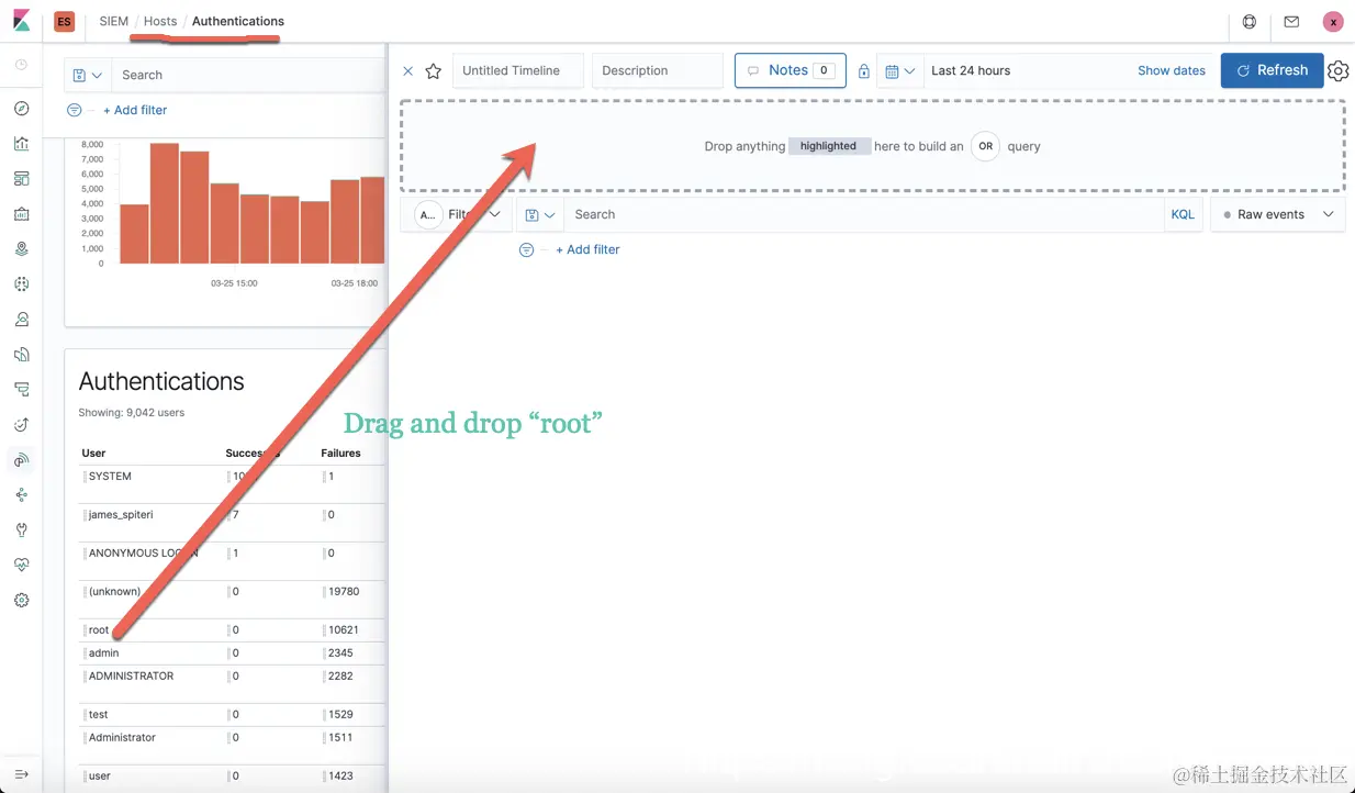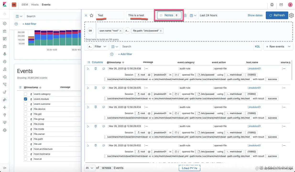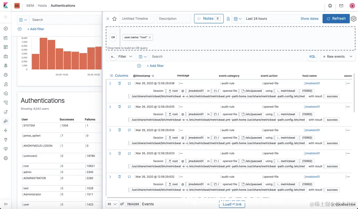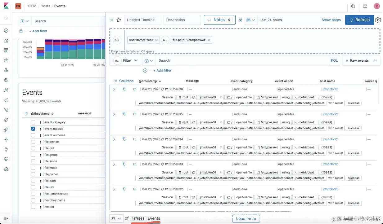 在 Timeline 的窗口中,我们可以看到所有的 Authentication 用户为 root 的事件。我们接着可以再添加一个条件来进一步缩小范围,比如我们想查询所有的用户为 root,并且file.path 为 /etc/passwd 的事件: