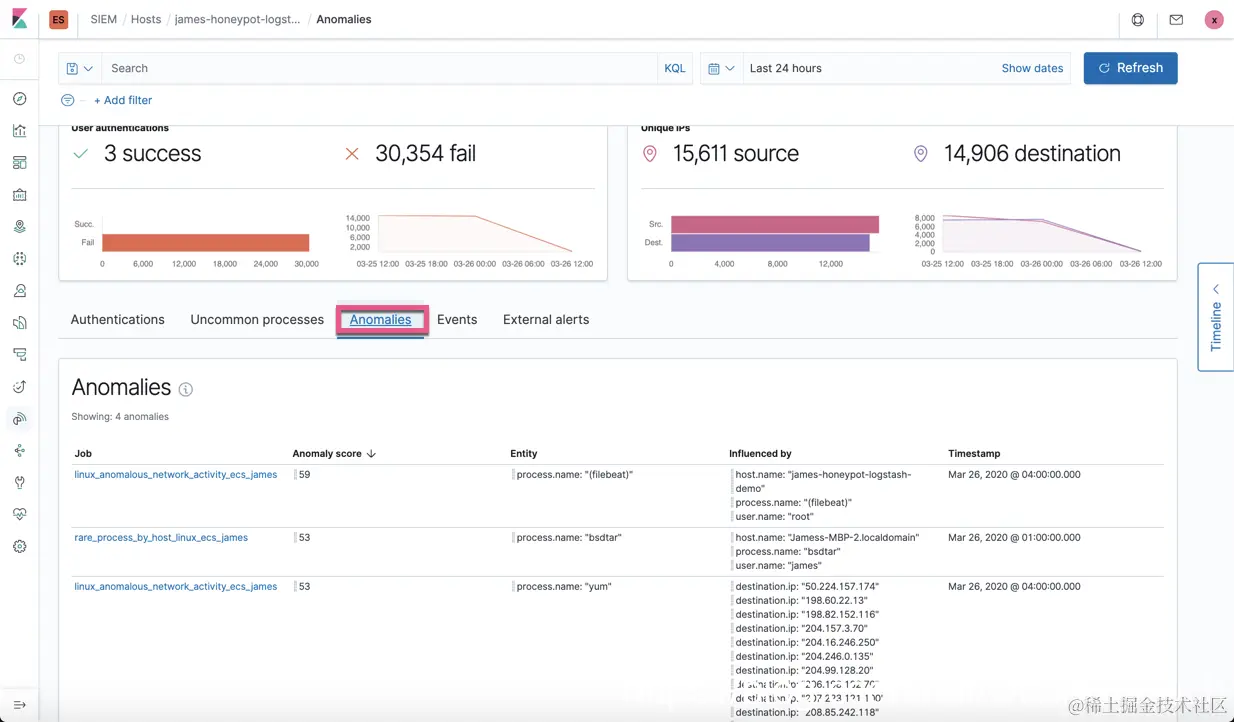 那么它将只显示 agent.hostname为james-honeypot-logstash-demo 的相关文档。如果大家对搜索还不是很熟的话,请参阅我之前的文章 “Kibana: 如何使用 Search Bar”。
