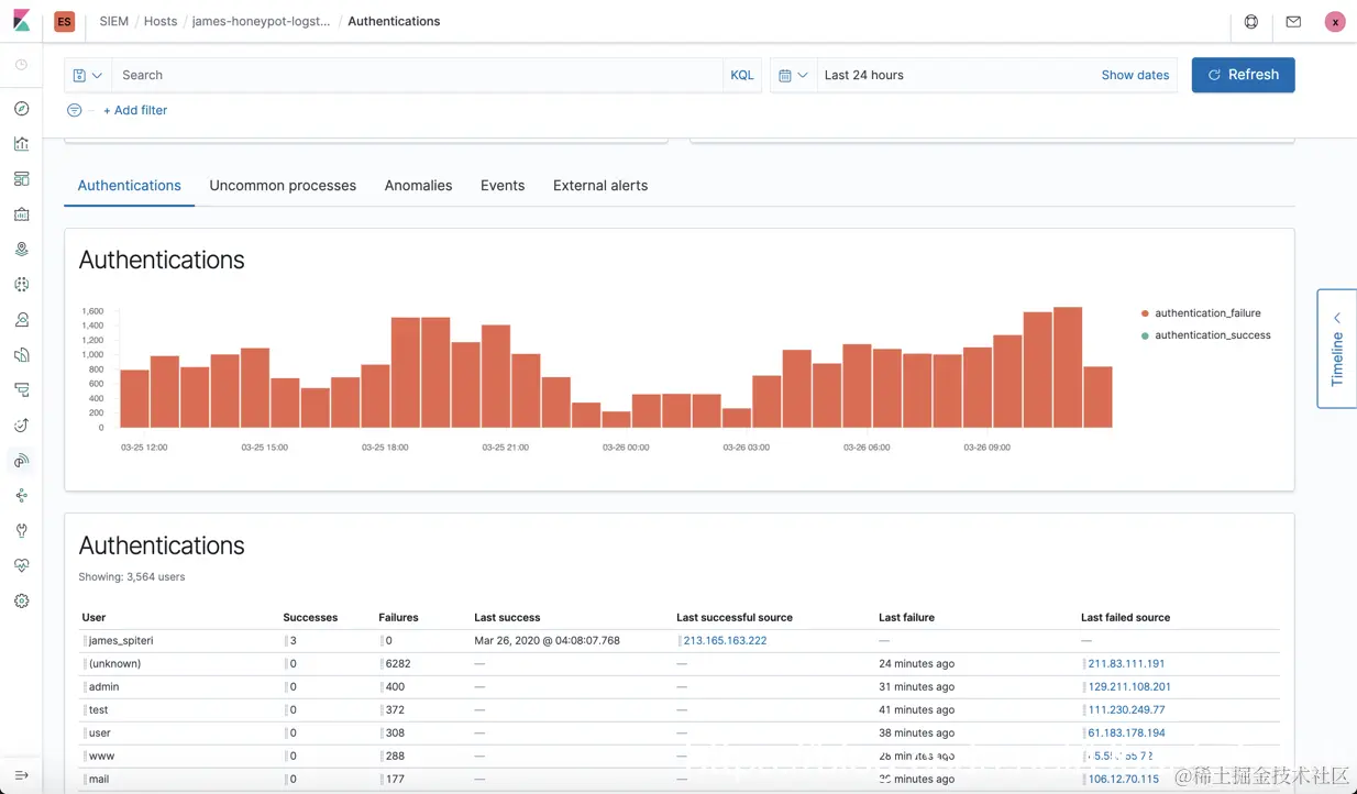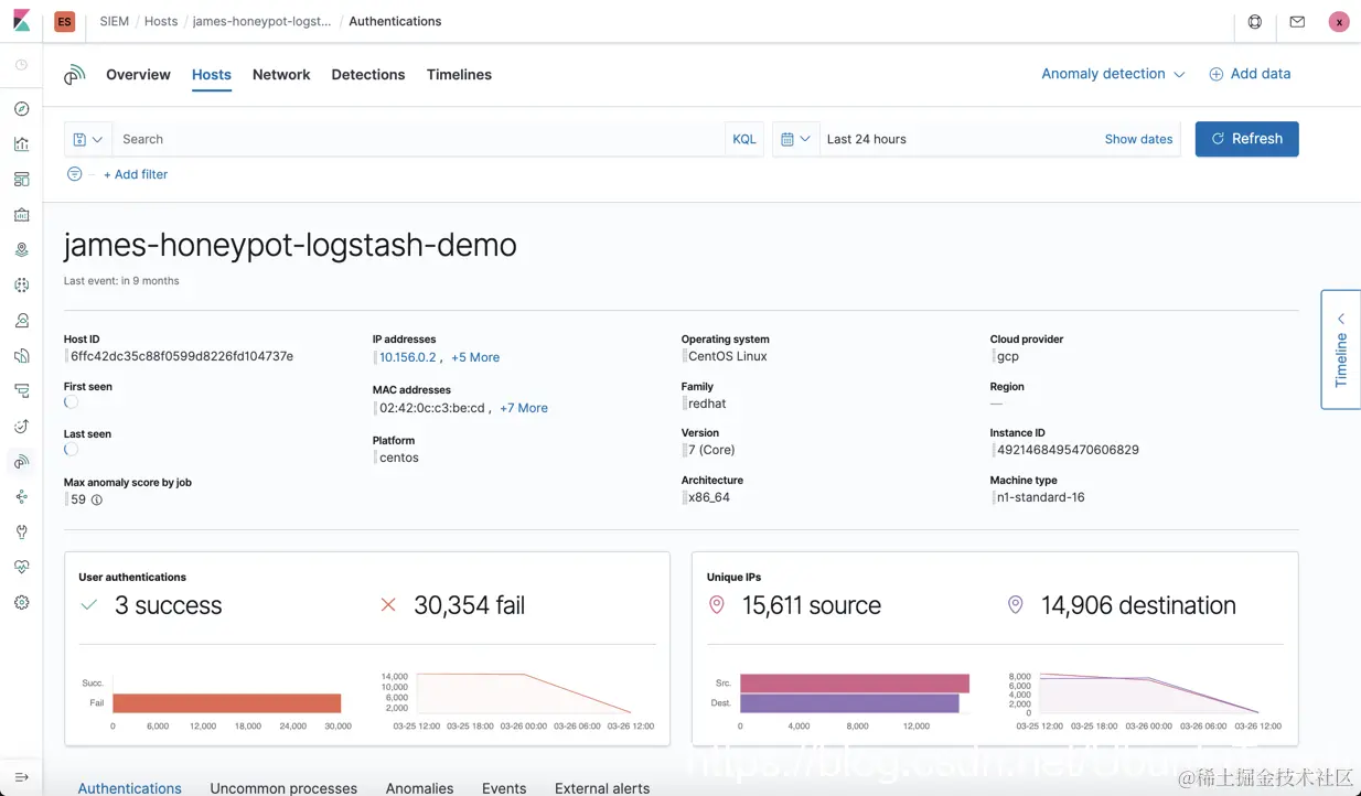 我们可以看到所有7个 hosts 的总揽情况。有多少个成功登陆的,有多少次失败的登录。在下面它分别显示了所有的 hosts 的列表。我们点击其中的一个 host,比如 james-honeypot-logstash-demo,我们可以看到关于这个 host 的统计情况: