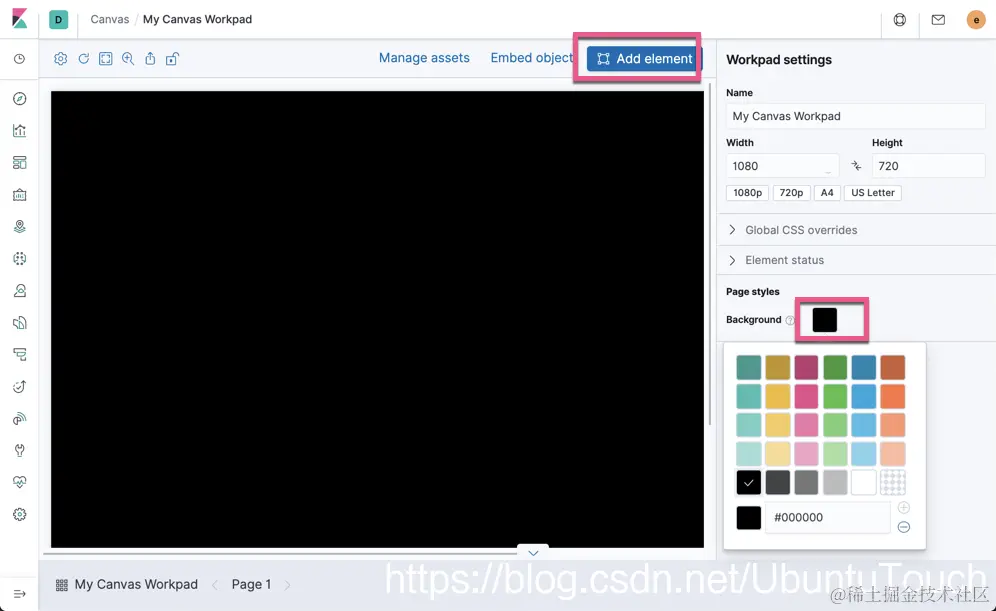 我们点击上面的Background,并选择我们喜欢的颜色,比如黑色。我们点击上面的Add element: