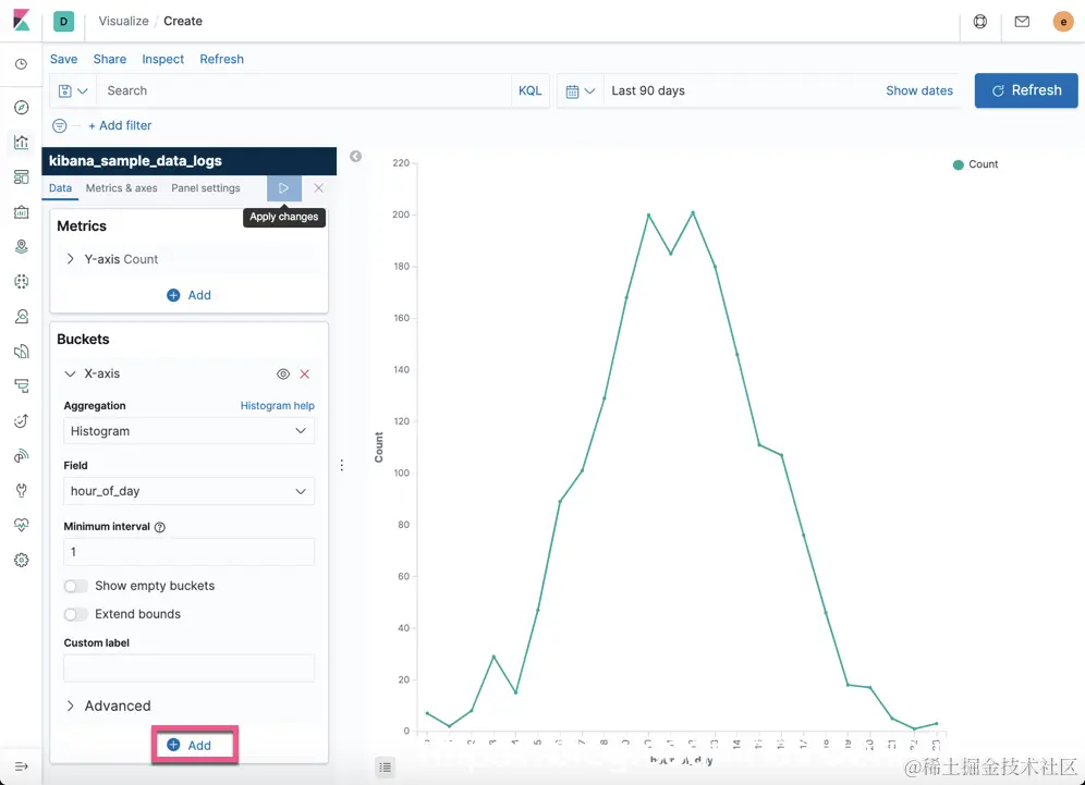 我们按照上面的配置可以生成每个小时的访问量的分布图。上面显示每天的10点到14点是访问最繁忙的时段。我们可点击下面的Add链接来添加一个新的bucket来展示最热的5个访问网址: