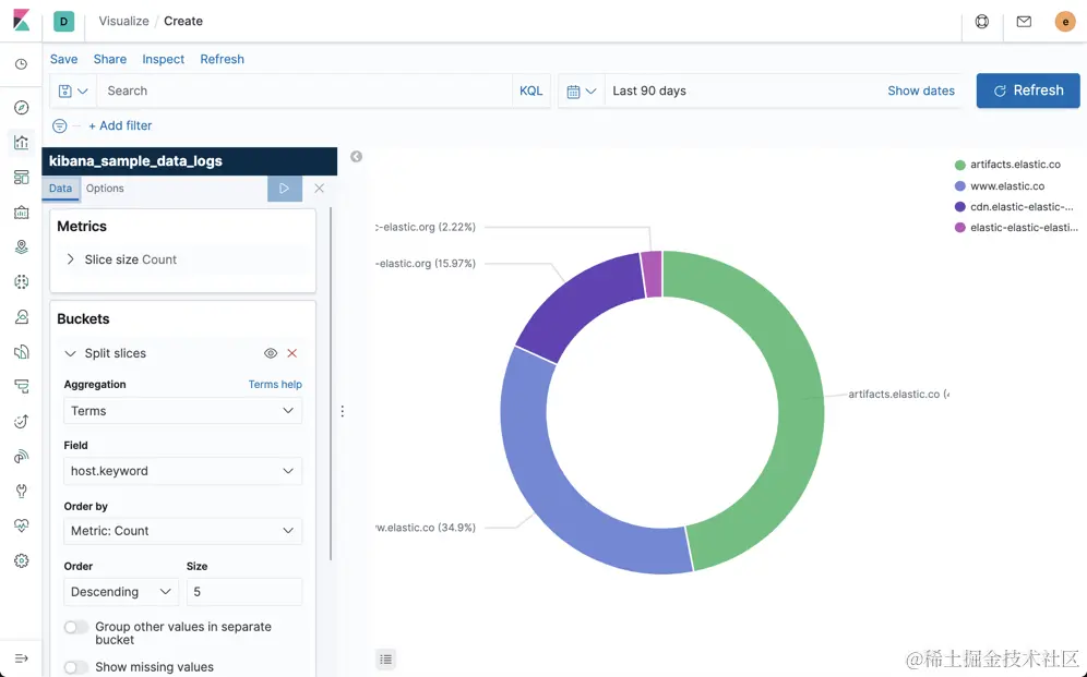 按照上面所示的配置,并在options里选择“Show labels”,这样就可以形成如上图所示的Pie形的前5个访问最多的网址。我们点击上面的Save保存上面的visualization 为v-1。