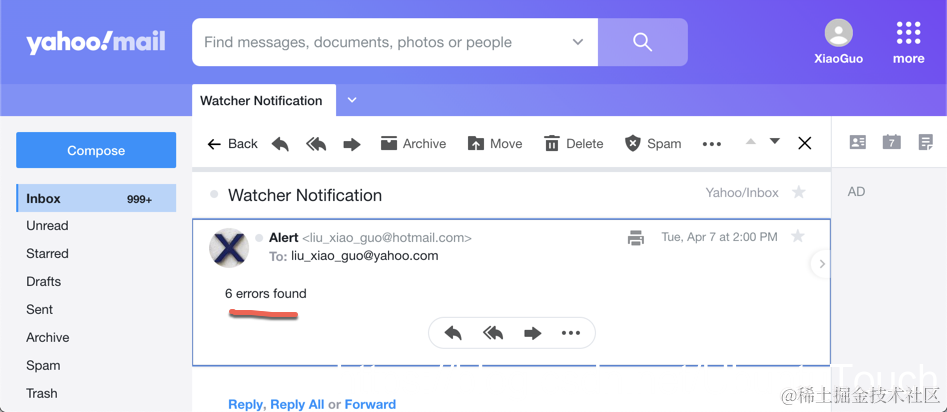 在上面,我们把触发的通知发送到我们的一个邮箱里,并冠以 Watcher Notification 的标题。里面的内容展示了 “xx errors found”。另外请注意 throttle_period 的用法。由于我们的 watcher 是每一分钟运行一次的。针对有些情况,如果条件满足的话,Watcher 会每一次都发送一个通知的信息。这样会造成垃圾邮件。我们不希望 Watcher 每次运行都发送。上面设置为2m,也就是2分钟的时间。在两分钟时间内发送一次通知。