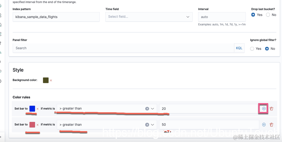 我们接着做如上的配置。上面显示如果数量超过20,就用蓝色来显示,如果超过50就用红色来表示。记得上面的数值的顺序。经过上面的配置过后,我们再来重新查看我们的visualization: