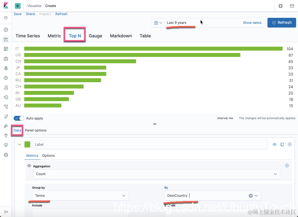 按照我上面的选择,你就可以看到Top 10的所有DestCountry的统计图了。记得在右上角选择合适的时间段。这个图可能不是我们想要的最终的结果。我们再次切换到Panel Options: