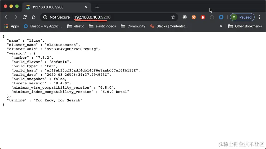 等修改完我们的 IP 地址后,我们保存 elasticsearch.yml 文件。然后重新运行我们的 elasticsearch。我们可以在一个浏览器中输入刚才输入的IP地址并加上端口号 9200。这样可以查看一下我们的 elasticsearch 是否已经正常运行了。
