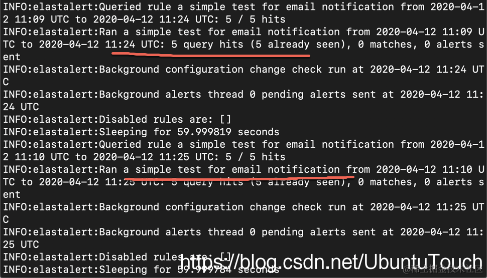 这样我们的 Elastalert 已经被成功运行起来了。我们在这个时候可以打开我们的 Kibana 来监视 filebeat-* 索引,如果在一个小时内有三次 process.name 信息有 JUSTME 字样,那么我们就会在我们的邮件里收到通知。