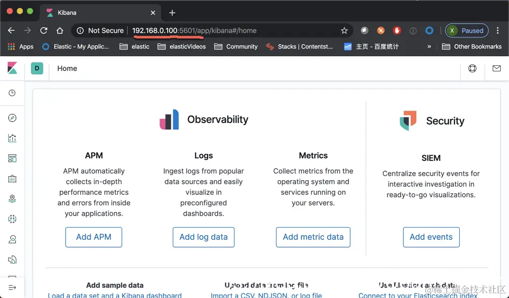 同时在浏览器的地址中输入自己的 IP 地址及5601端口: