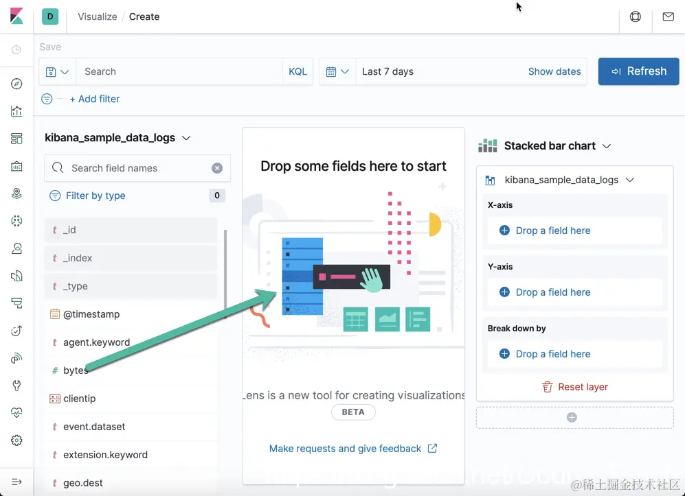 在通常的情况下,我们会现在左边的Visualization来可视化我们的数据。如上图所示,这次我们选择Go to Lens。它可以为我们创建一个更为直观的可视化方法。通常这可以发生在我们一开始并不知道我们想要什么,也许就是通过拖拽的方法来生成一些可以供我们分析的洞察。另外这种方法也使用于对Elasicsearch毫无了解的一些人。点击上面的Go to Lens: