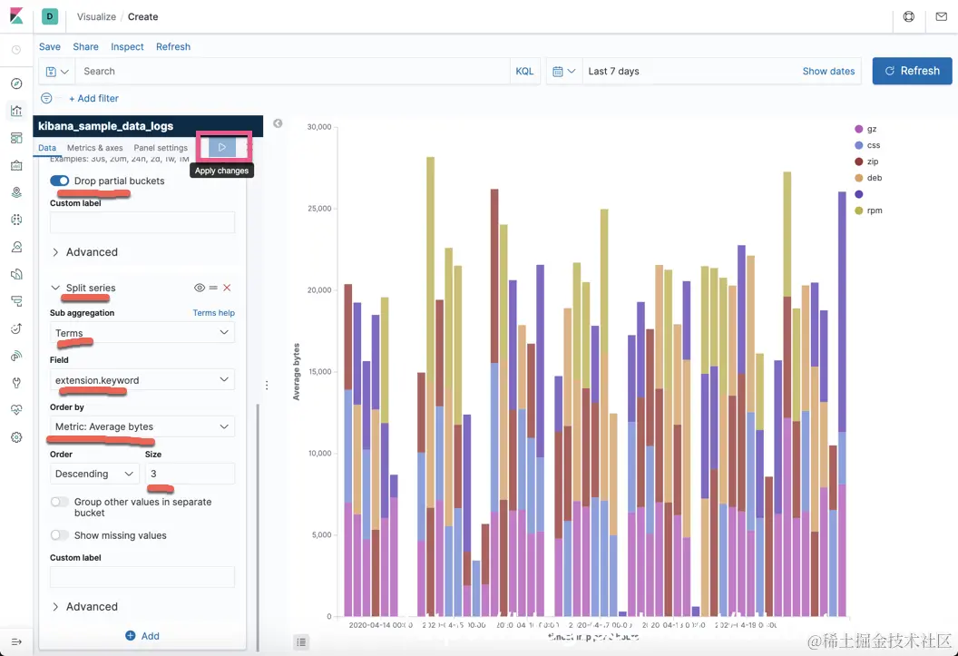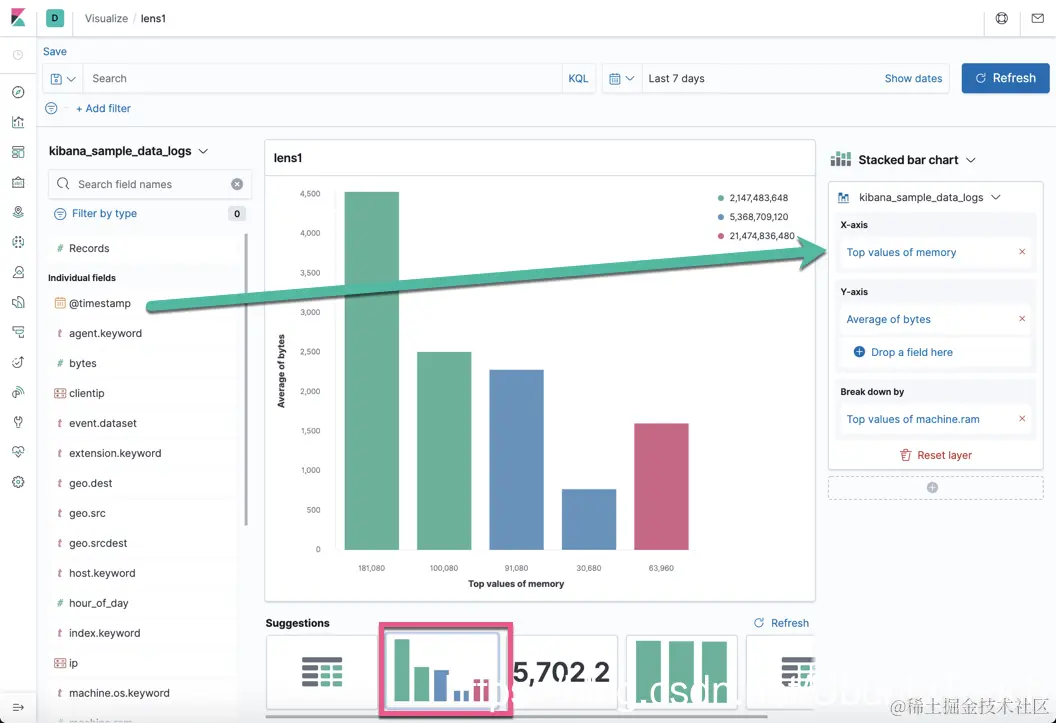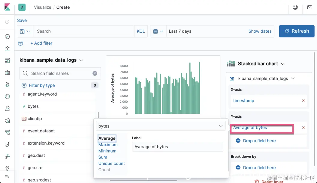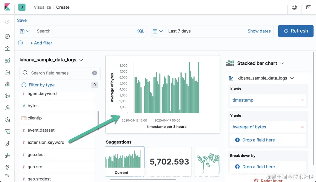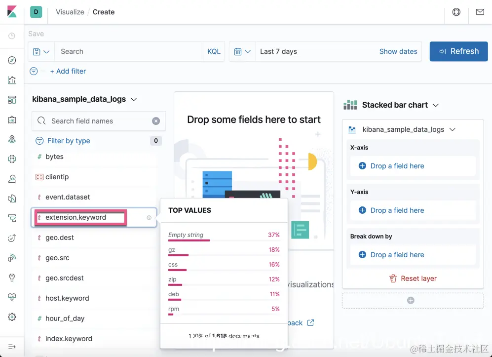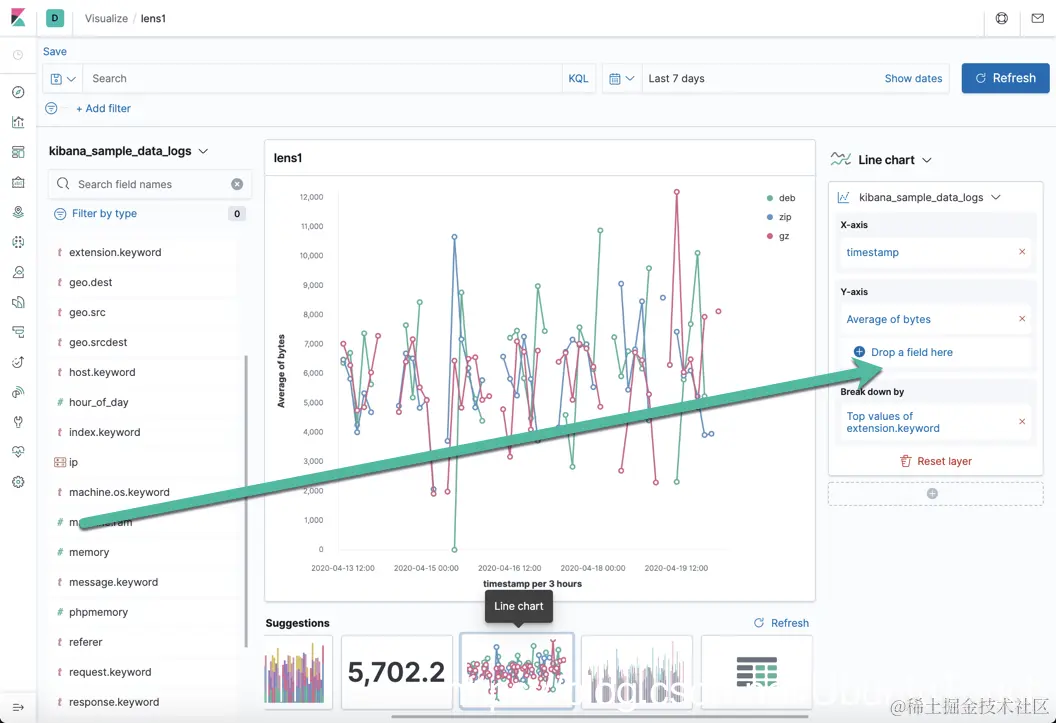 上面我们针对bytes字段进行了分析。但是Lens不仅仅至于这样的分析,我们甚至可以在上面的可视化区域拖拽更多的字段来进行分析。我们拖拽另外一个叫做extension.keyword的字段: