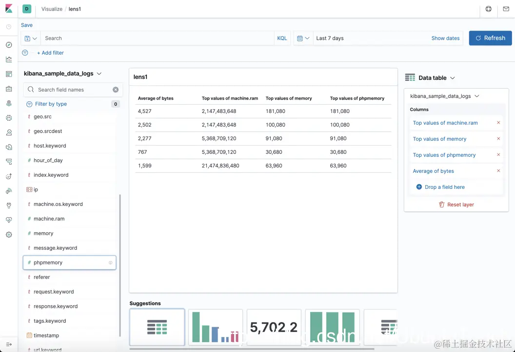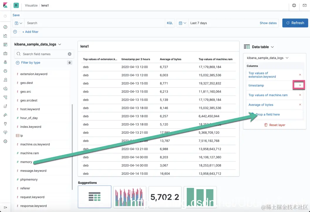 我们可以通过拖拽更多的感兴趣的字段到右边的Drop a field here区域。我们也可以把不感兴趣的字段比如timestamp去掉。