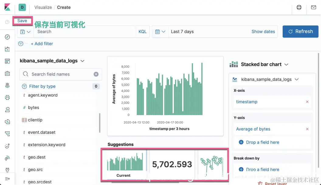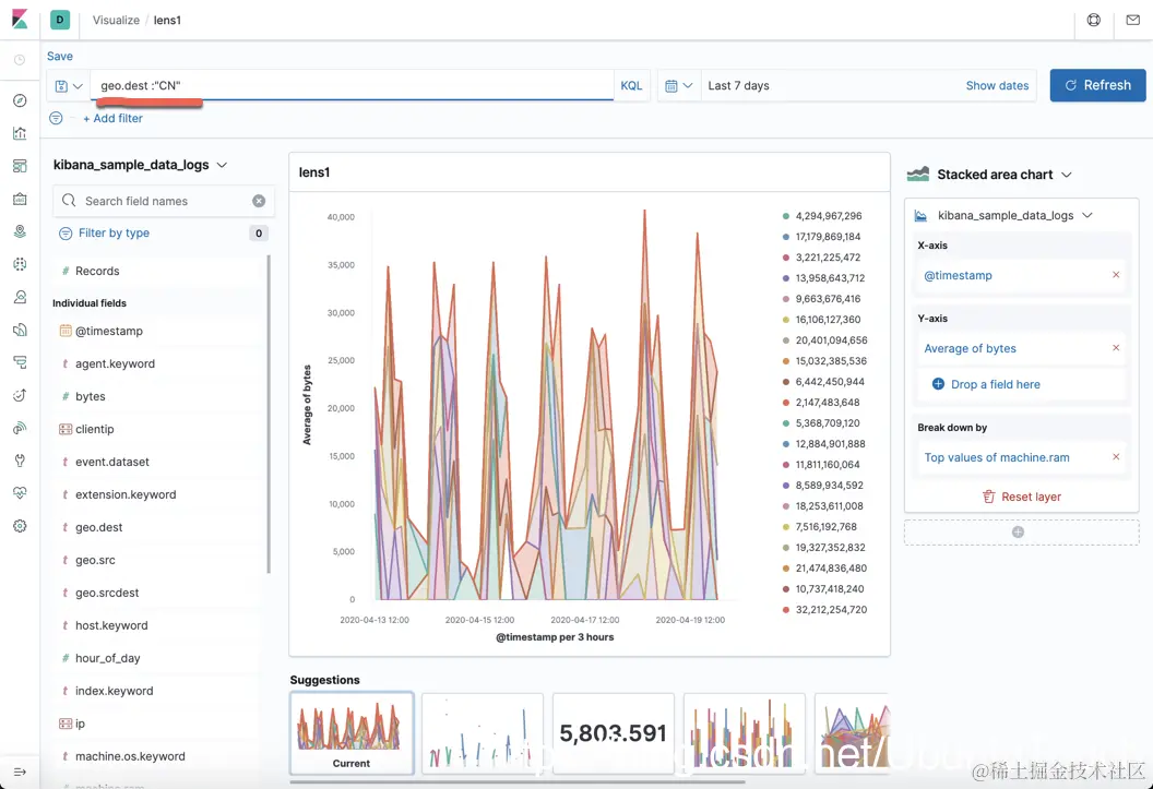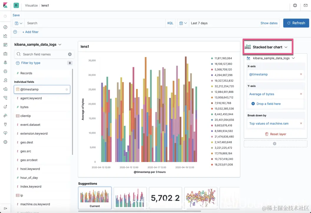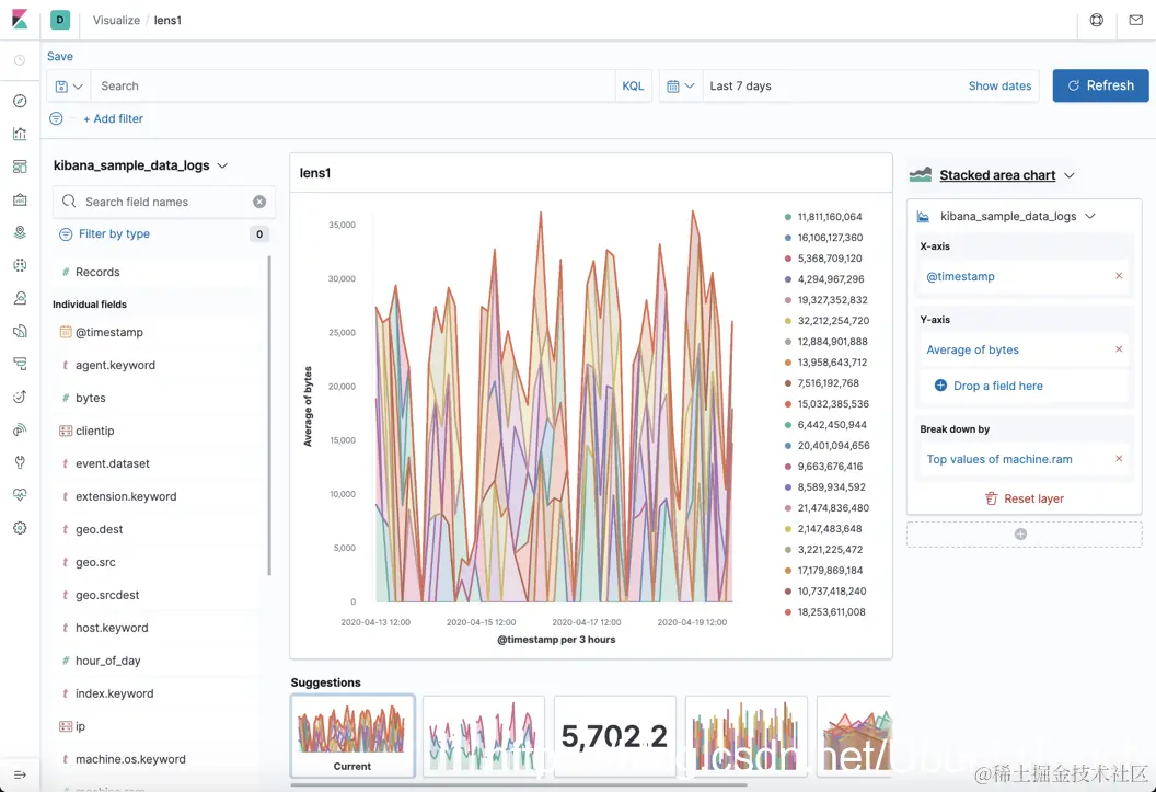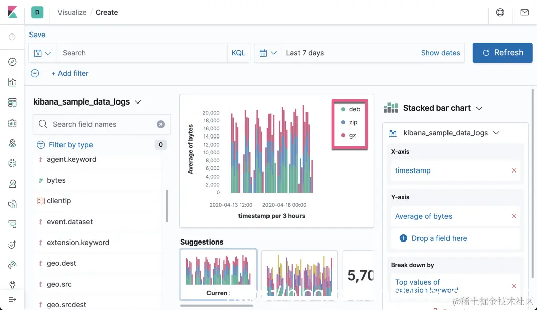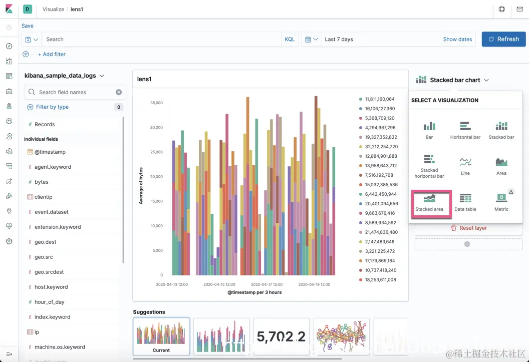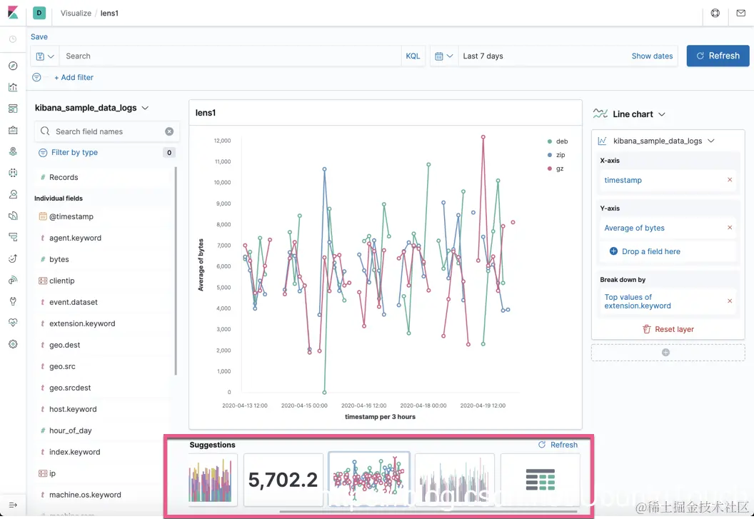 很显然,在上面的可视化中,我们使用了两个字段bytes及extensions.keyword。在上面的图中,我们可以看到每个时间的按照extensions.keyword的分布大小。这样更直观给我们可视化的分析。同样地,在下面的suggestions区域,我们可以看到各种不同的可视化选择供我们进行选择。