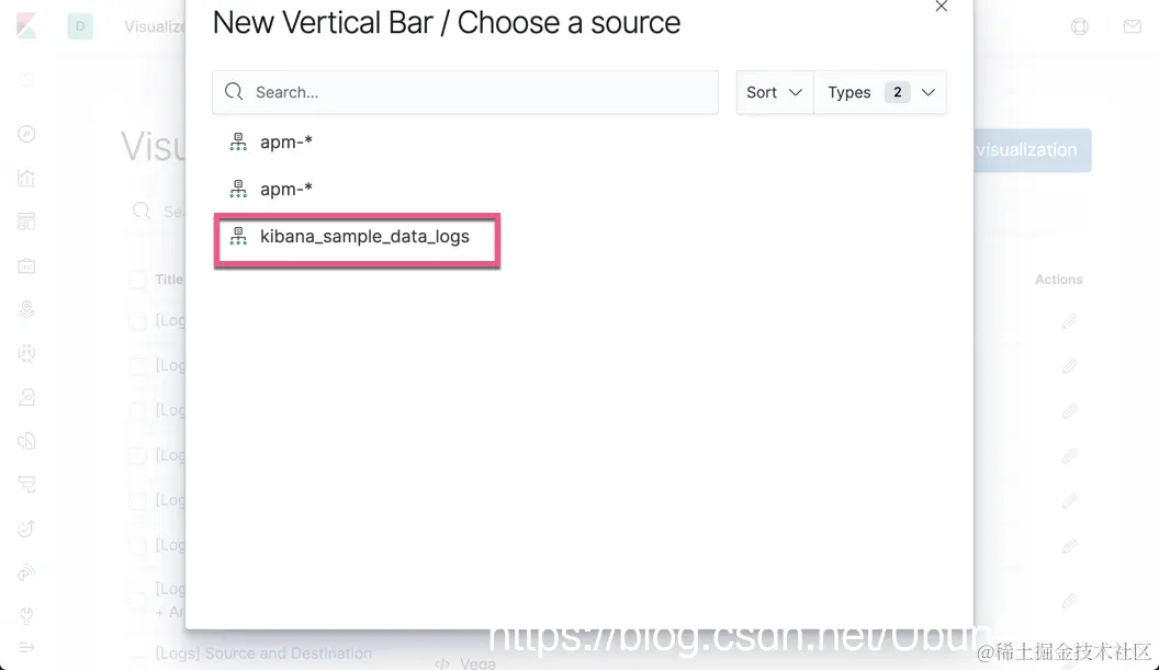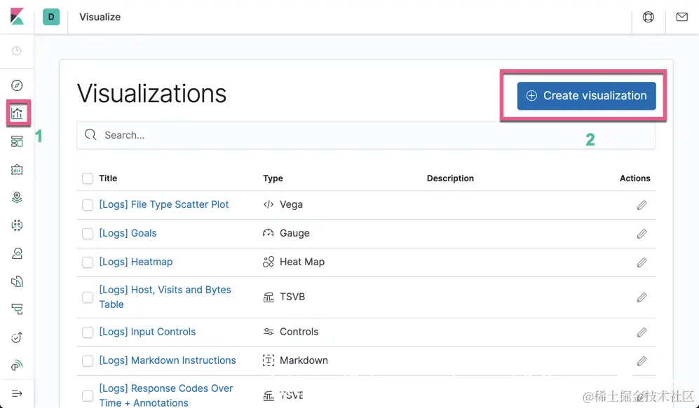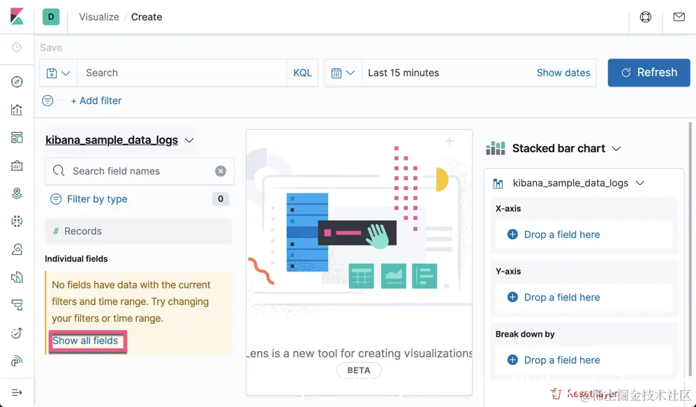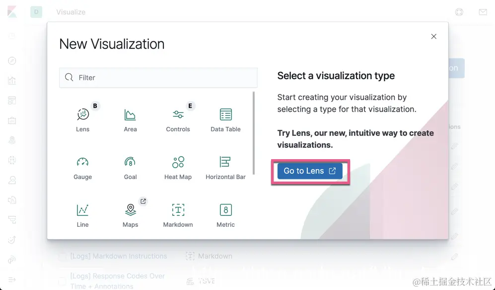 接着我们来对刚刚导入的kibana_sample_data_logs索引进行Lens的可视化。我们首先点击visualization: