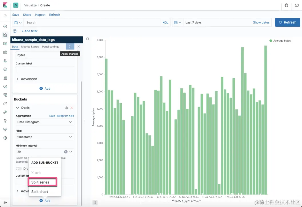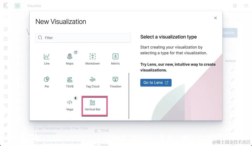 我们要知道,在之前没有Elastic Lens之前,我们需要如下复杂的步骤来实现这个,并且你还必须对Elasticsearch有一个比较深入的了解才可以。为了实现上面的可视化,我们可以选择一个Vertical Bar: