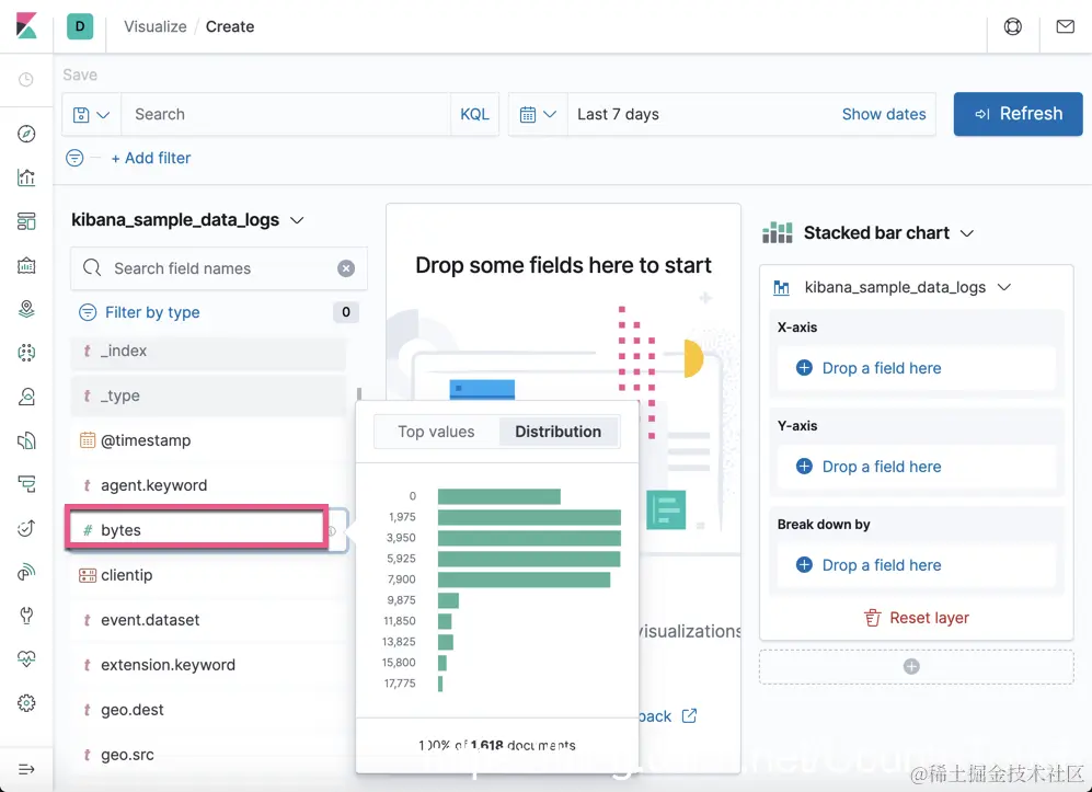 我们把上面的bytes这个字段通过拖拽的方式把它拖到中间的“Drop some fields here to start”区域: