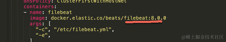 2) 依据文档中的介绍,它使用的是 filebeat:8.0.0 的版本,显然这个不是我们所需要的版本,而且目前 Elastic Stack 的最新的版本是7.6.2。我们部署的 Elastic Stack 的版本也是7.6.2。所以这个部分我们需要做修改。把版本改为7.6.2 (在写这篇文章的时候,由于一些原因,7.6.2的 image 下载有困难。尝试7.5.2是成功的)。