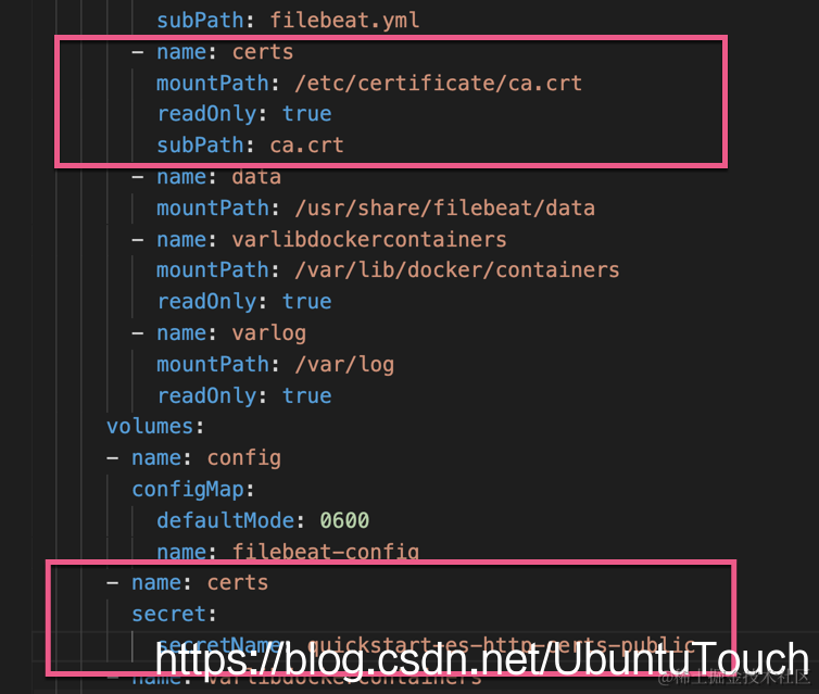 3)配置 Filebeat 访问 Elasticsearch 所需要的证书(ConfigMap 部分):
