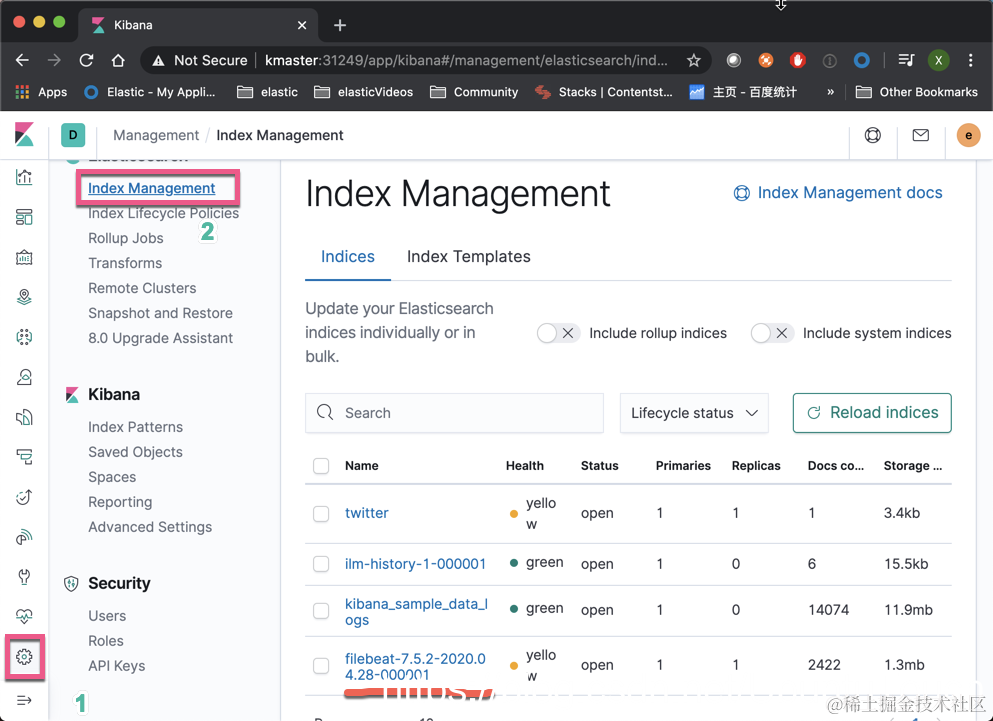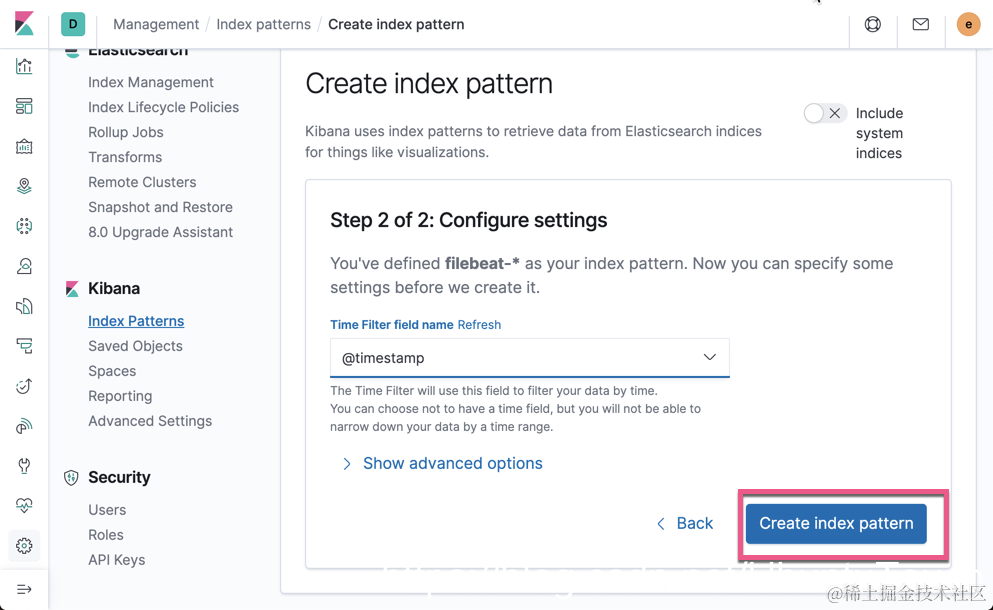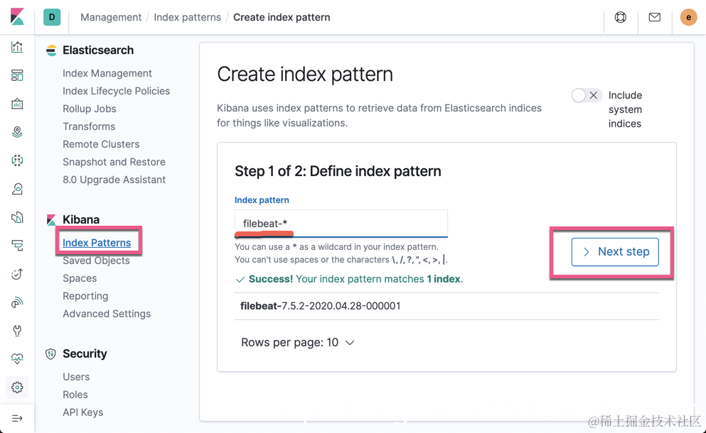 我们打开 Index Management 的界面,我可以看到有一个 filebeat-7.5.2-2020.04.28-000001 的索引。这个就是我们的 Filebeat 收集所有的 pod 的索引。我们创建一个 filebeat-* 的index pattern: