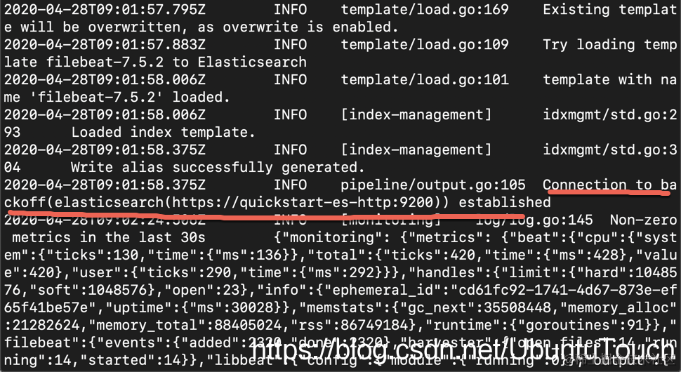 从上面,我们可以看出来,我们的 Filebeat 已经成功地连接到 Elasticsearch。