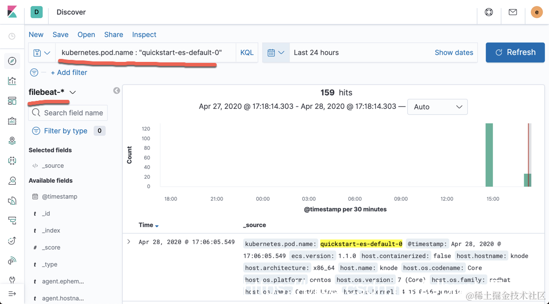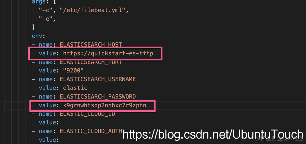 上面显示了 Kubernetes 的所有的 secret。还记得我们之前密码的来处吗?它就是来自上面的 quickstart-es-elastic-user。对于 Filebeat 所需要用到的证书,它将来自 quickstart-es-http-certs-public。我们将把这个拷入到 Filebeat 的容器中,以使得 Filebeat 能够正常访问我们的 Elasticsearch。