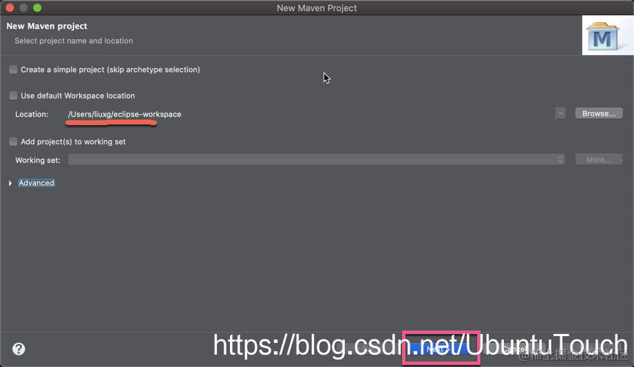 我们接下来选择自己额 workspace 位置,并点击 Next: