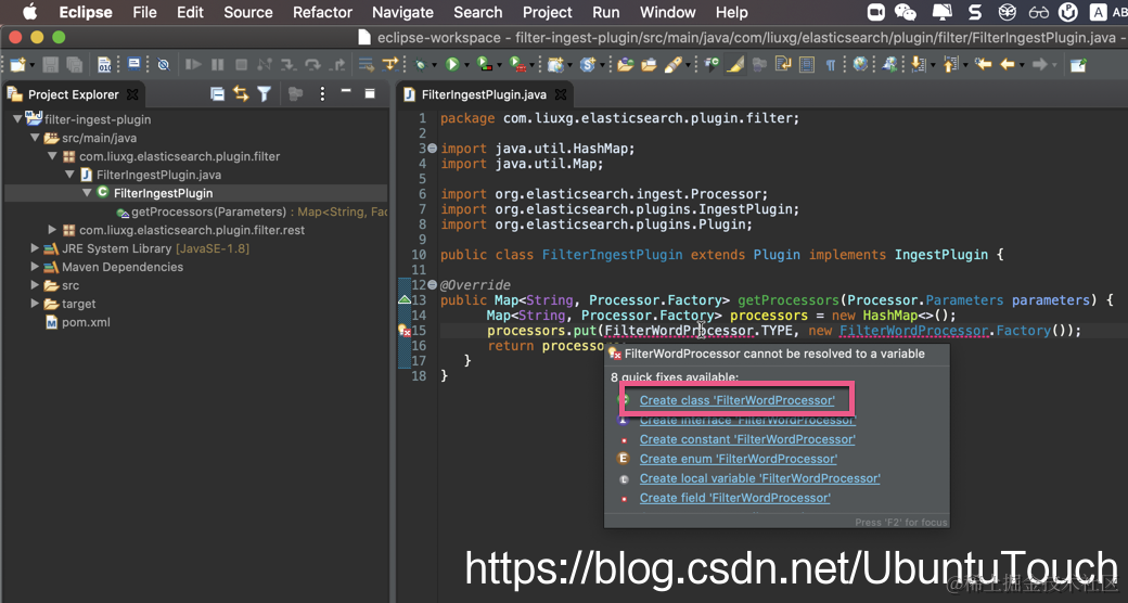 一旦安装了插件,getProcessors方法将返回一个或多个可由Elasticsearch使用的 ingest 处理器。 在这种情况下,我们将通过以下实现注册FilterWordProcess类提供的一个处理器。我们接着点击上面红色标识的链接,并生产另外一个叫FilterWordProcessor.java的文件: