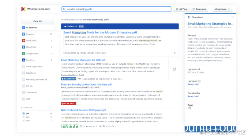 我们同时还了解到,并非团队中的所有人都可以访问相同的信息,所以 Workplace Search 能确保反映正确的内容权限,从而在提高相关性的同时增强权限控制功能。某些人只是将信息安全视作锦上添花,而我们则将信息安全视作存在之本。