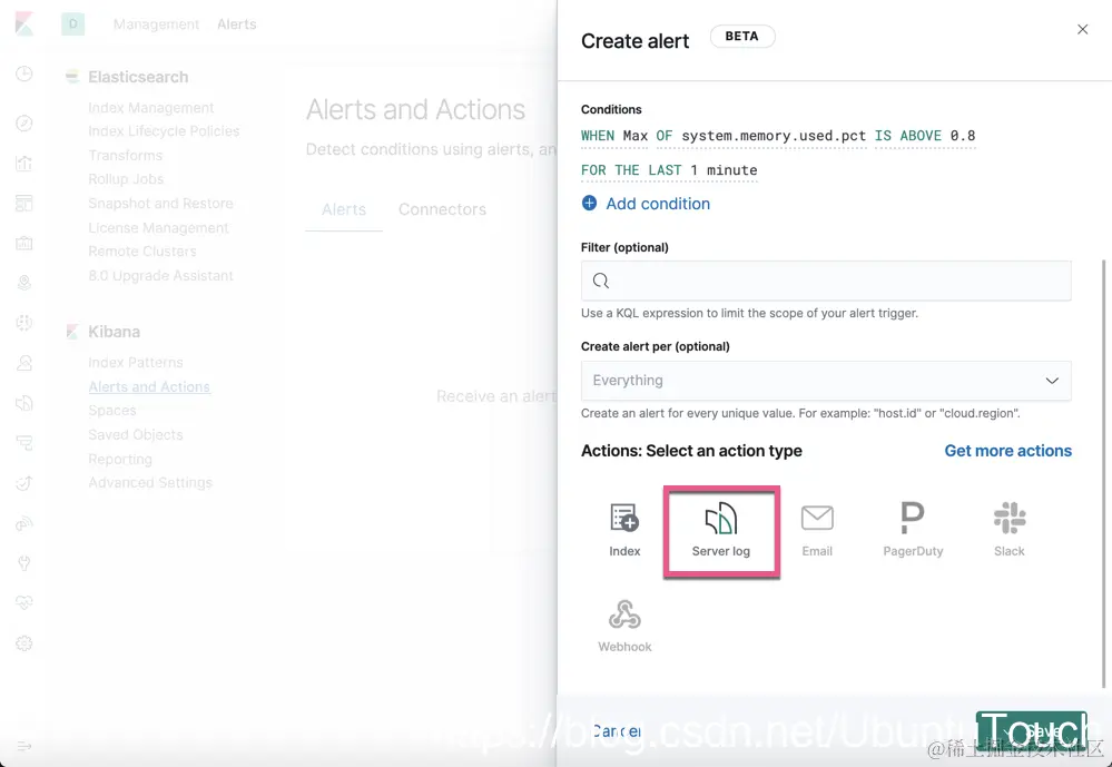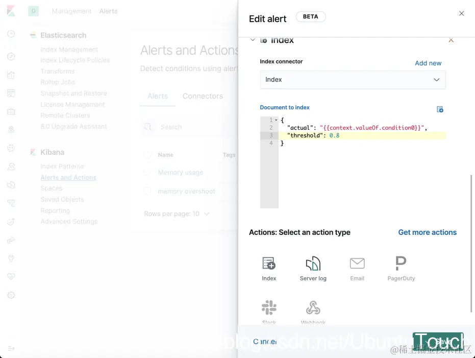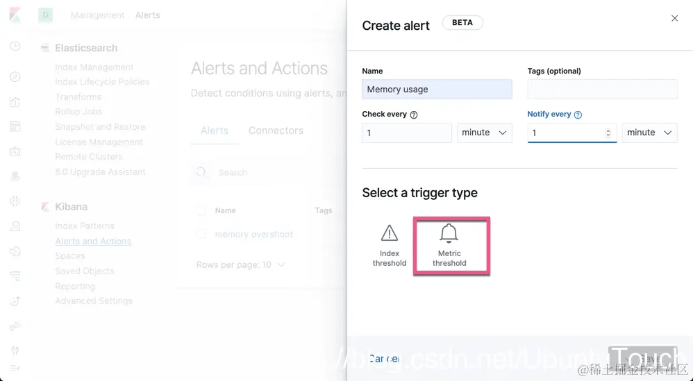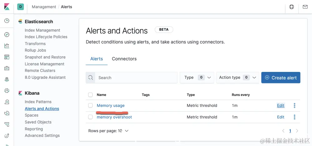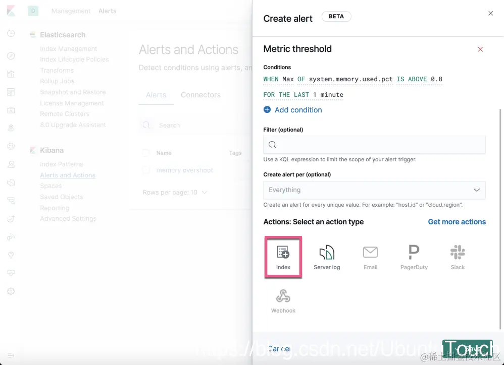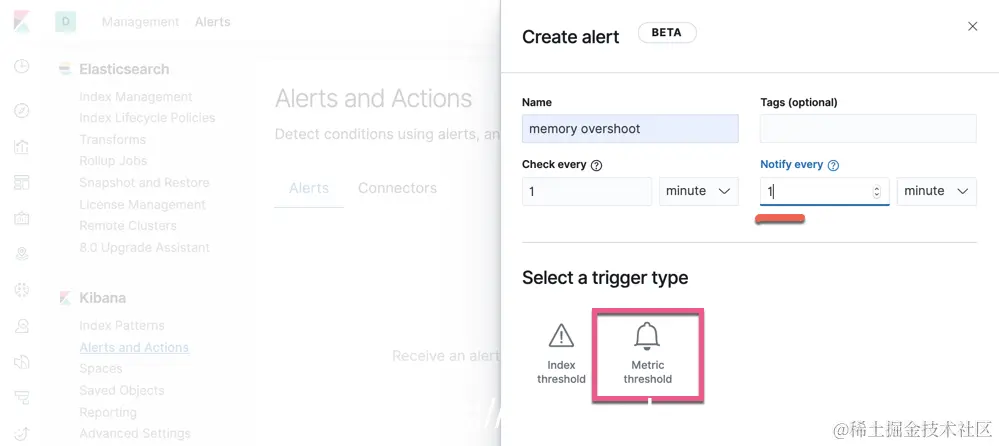 我们接着创建一个 Index 类型的警报。这次,我们不是在 Metricbeat 应用中创建的,我们可以在 Management 中开始。