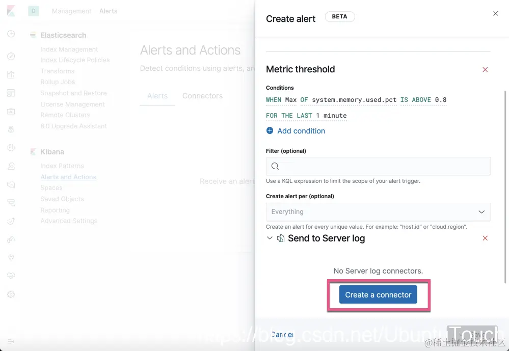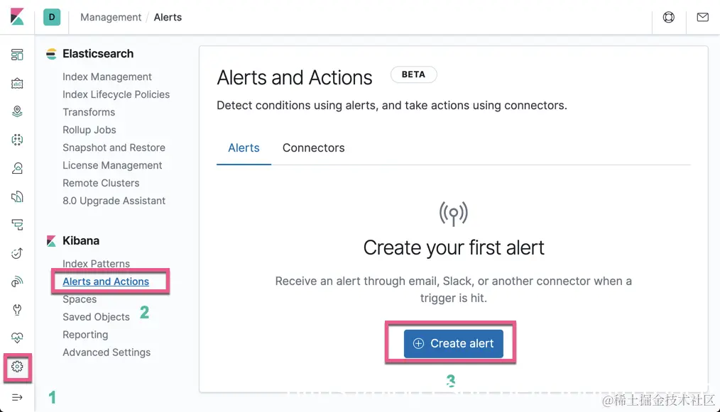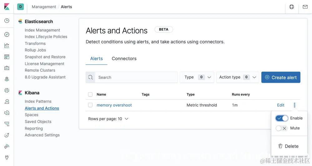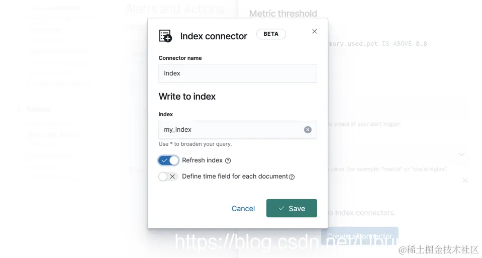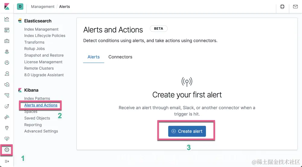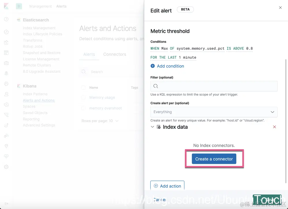 我们接着创建一个 Index 类型的警报。这次,我们不是在 Metricbeat 应用中创建的,我们可以在 Management 中开始。