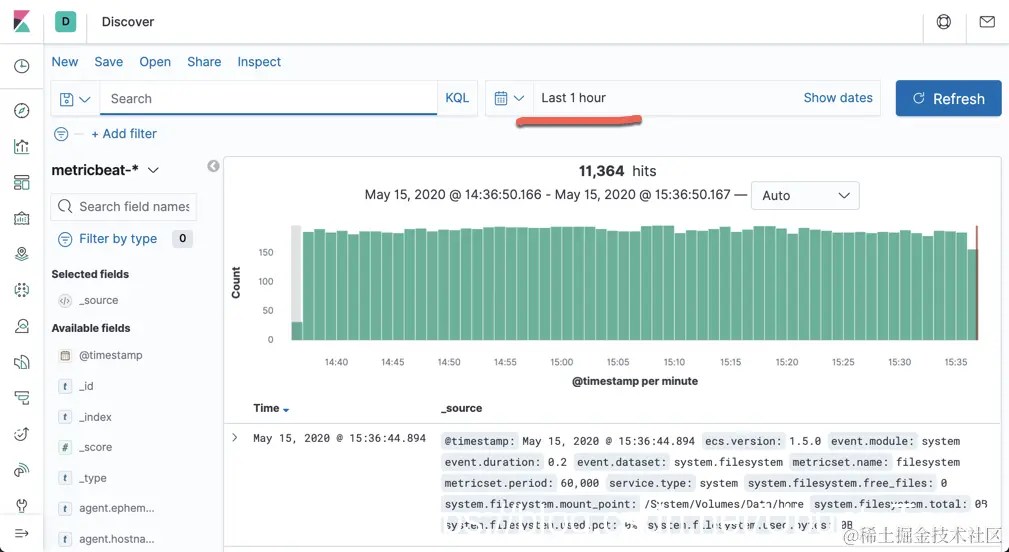 等我们安装好 Metricbeat 后,我们可以在 Kibana 的 Discover 看到导入的 Metricbeat 的数据: