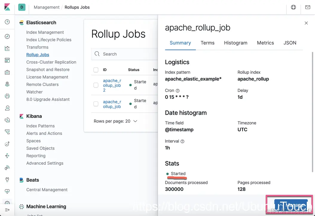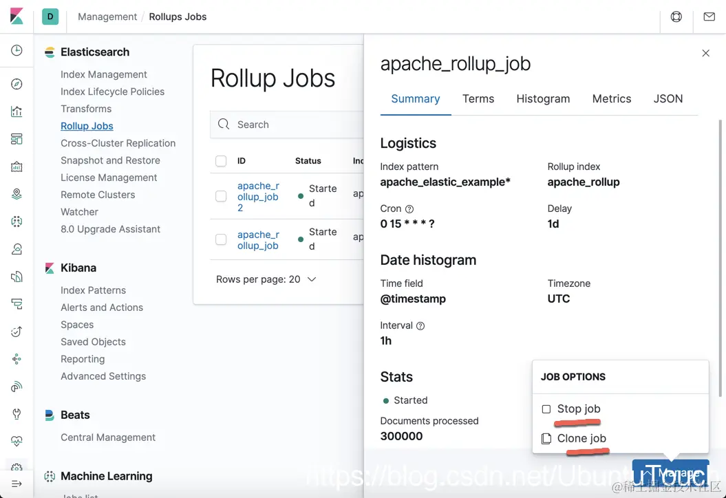 在上面,我们设置了几乎和界面一样的实现,只不过在这里,我们每隔10分钟来进行一次 rollup。在这里,我们把数据存于到 apache_rollup2 这个索引中。