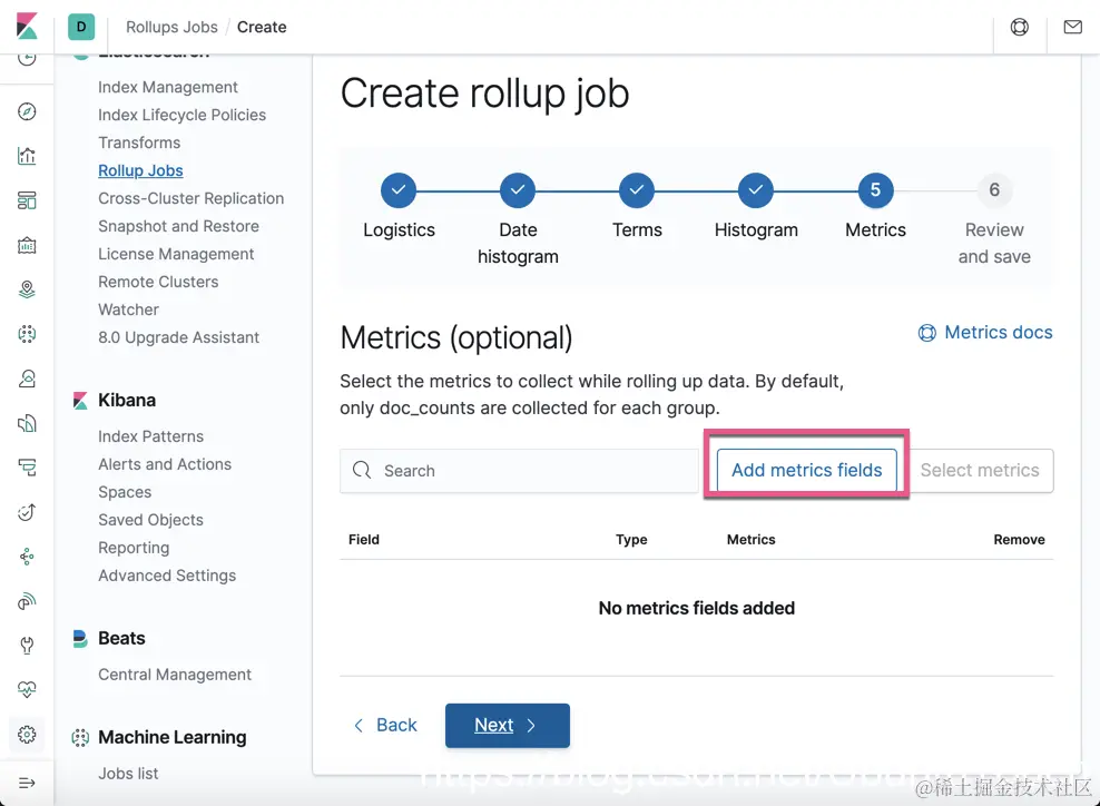 这个是对 Metrics 的配置。我们点击 Add metrics fields 按钮: