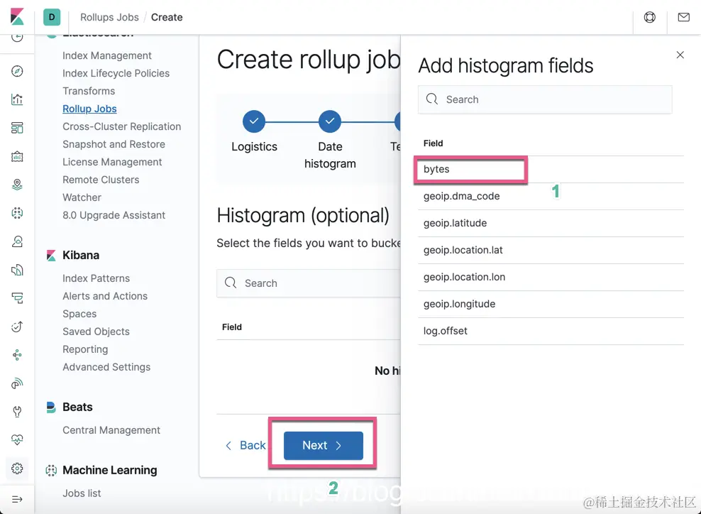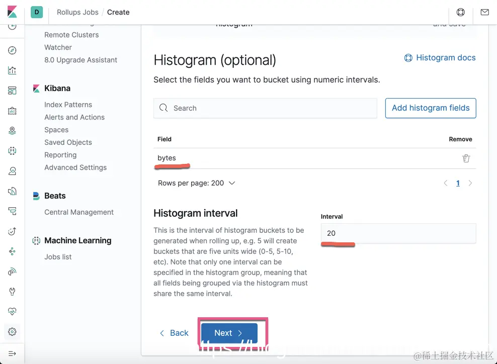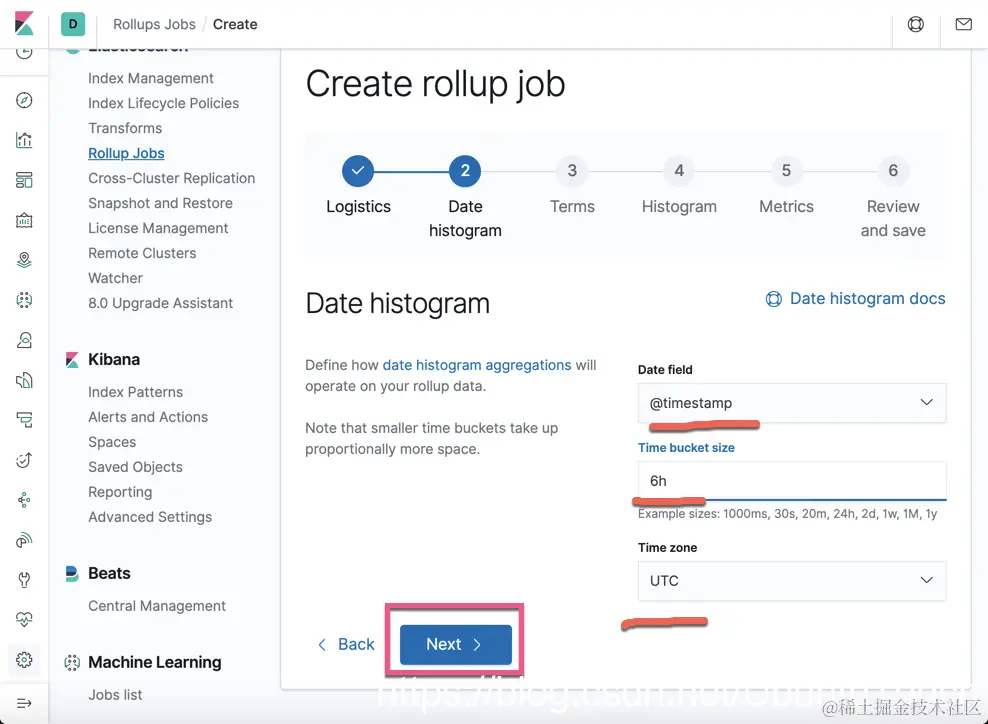 这个是针对 Date histogram 的配置。点击 Next 按钮: