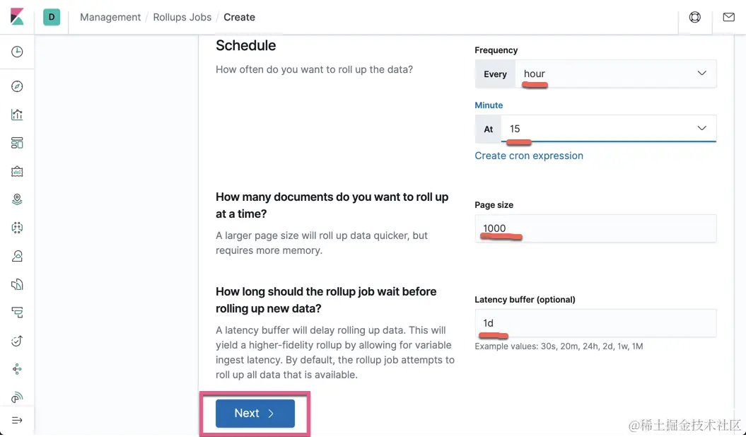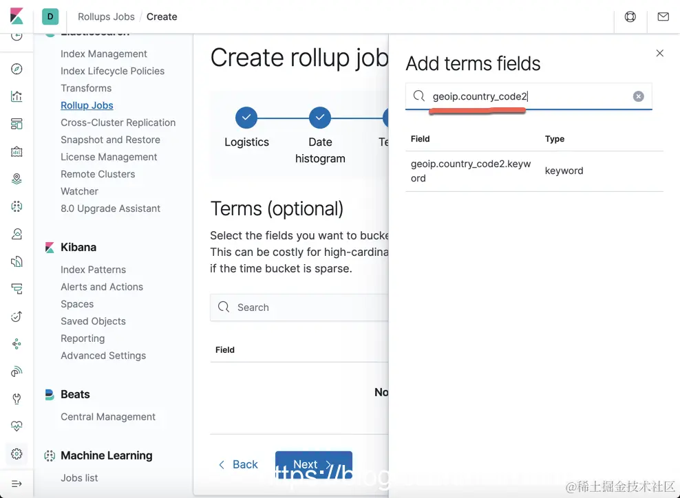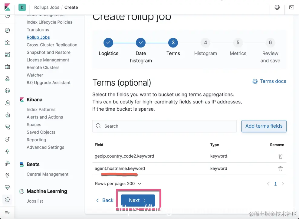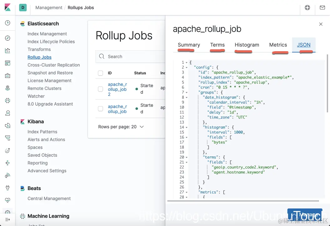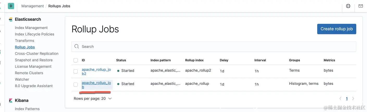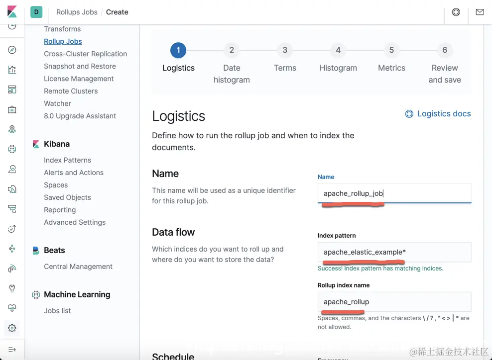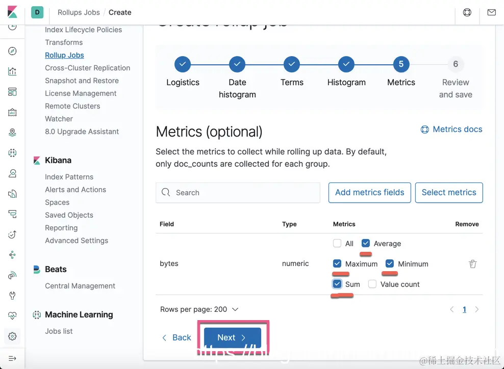 从上面我们可以看出来这个 rollup job 针对一个时间系列的索引。把屏幕向下滚动。
