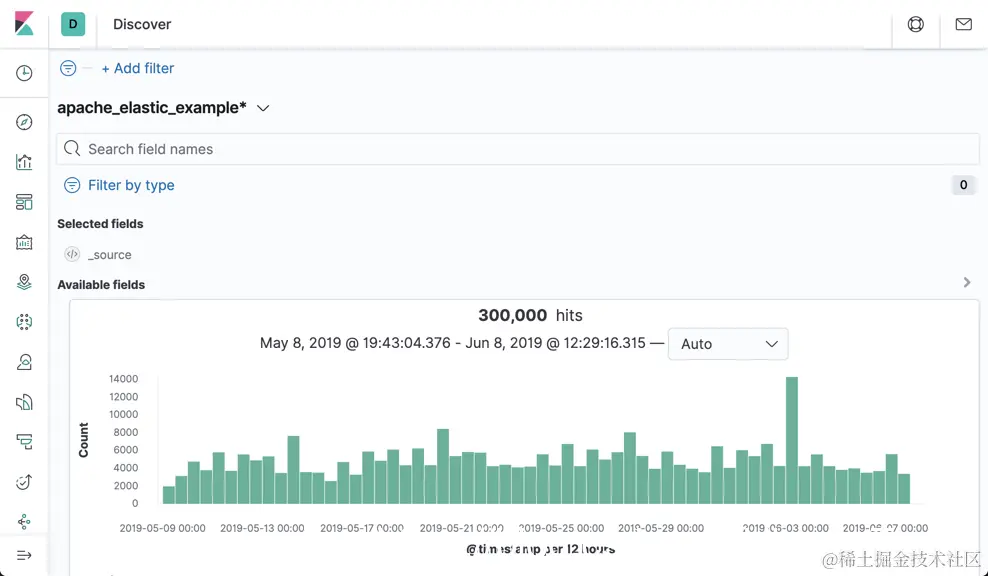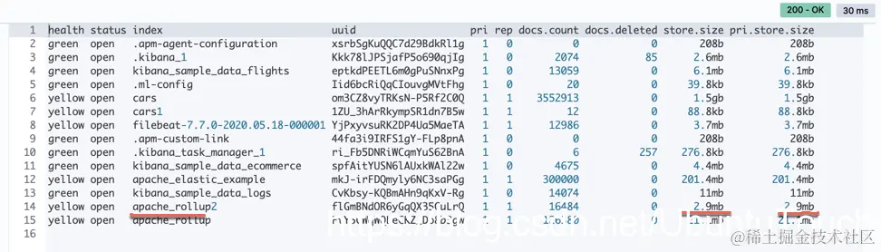 我们可以看到一个新的索引:apache_rollup。它的文件显示的非常之小。只有21.8M。是不是觉得不可思议啊。它相比之前的那个apache_elastic_example 来说,小了非常多。