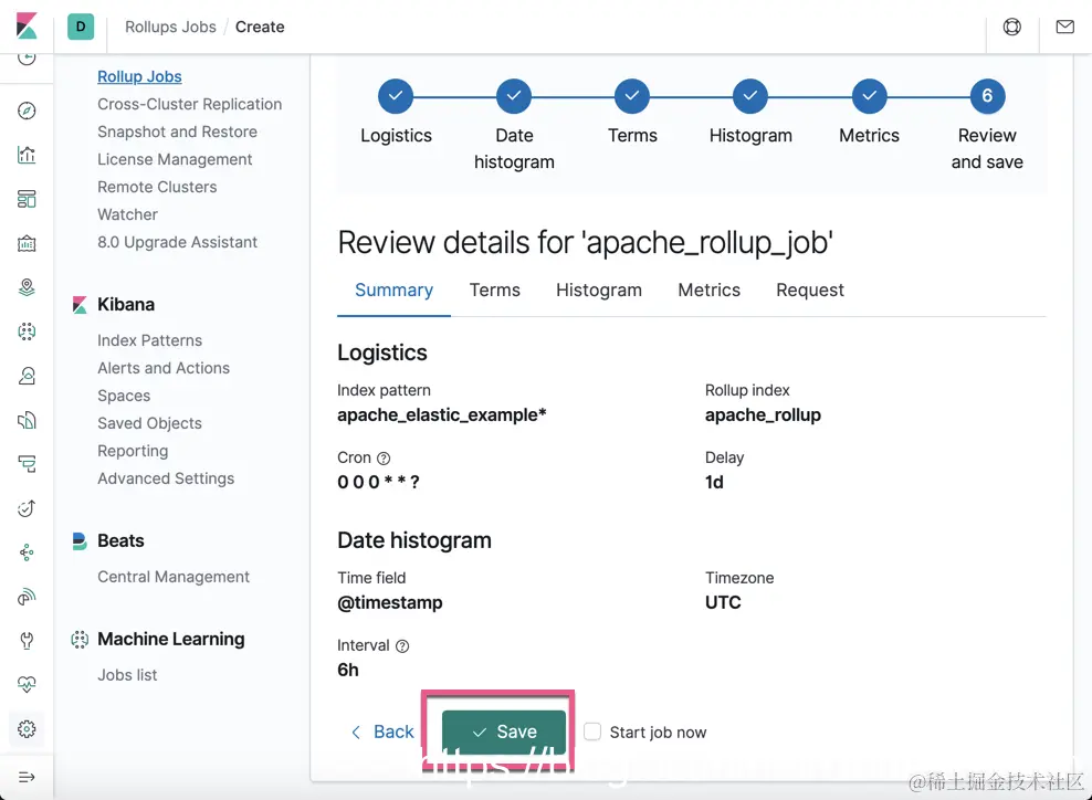 在这个页面我们可以看到这个 rollup 的 概览。如果你觉得不太满意,你可以点击 Back 按钮然后再进行重新配置。如果满意的话,我们点击 Save 按钮。如果你还想马上就开始这个 job 的话,勾上 Start job now。我们点击 Save,并勾上 Start job now: