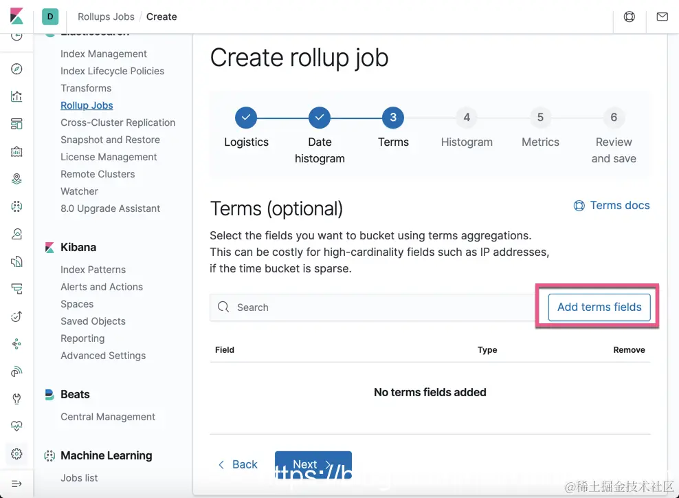 这个是针对 terms 的 选择。点击 Add terms fields 按钮: