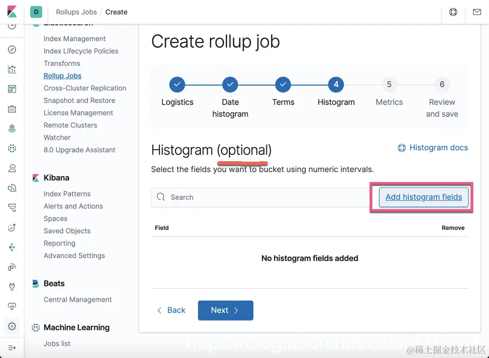 这个页面时可选项。如果我们感兴趣的话,那么我们点击 Add histogram fields: